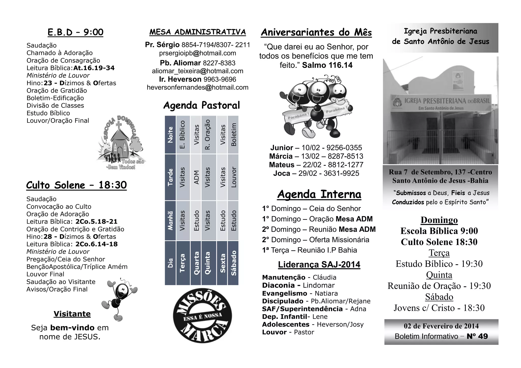 O documento é um boletim informativo de uma Igreja Presbiteriana que contém: 1) informações sobre aniversariantes do mês, contatos de pastores e líderes; 2) agenda de cultos e atividades; 3) lista de lideranças da igreja; 4) artigo sobre a criação de Deus segundo Gênesis; e 5) avisos sobre programas e eventos da igreja.