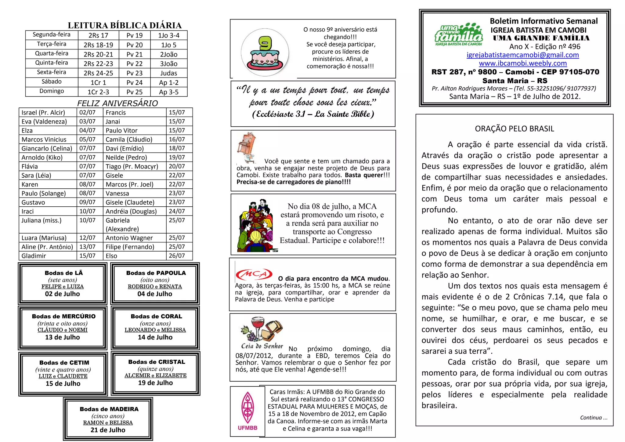 1) Aniversário da igreja e pedido de participação nos preparativos;