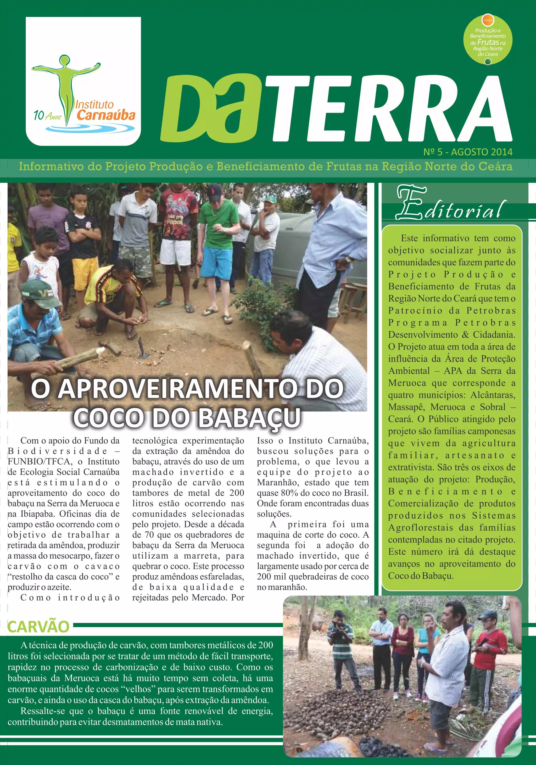 O Instituto de Ecologia Social Carnaúba, com o apoio do fundo da Biodiversidade, está promovendo o aproveitamento do coco do babaçu na Serra da Meruoca e na Ibiapaba através de oficinas e tecnologia de extração. O projeto visa melhorar a qualidade da amêndoa obtida e a produção de carvão, utilizando técnicas como o machado invertido e tambores de metal. As atividades incluem dias de campo que reúnem a comunidade e parceiros para troca de experiências e aprendizado sobre o beneficiamento de produtos agroflorestais.