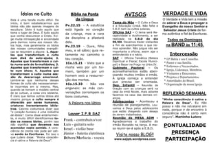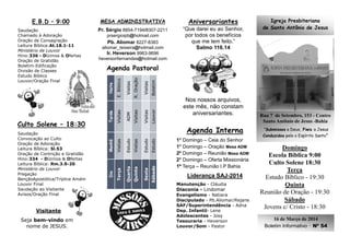 O documento é um boletim informativo de uma igreja presbiteriana que fornece detalhes sobre os serviços religiosos, liderança, agenda pastoral e avisos. Ele inclui o horário de atividades como cultos, estudos bíblicos e orações, lista os responsáveis por cada departamento, e anuncia eventos como oficinas e bazares.