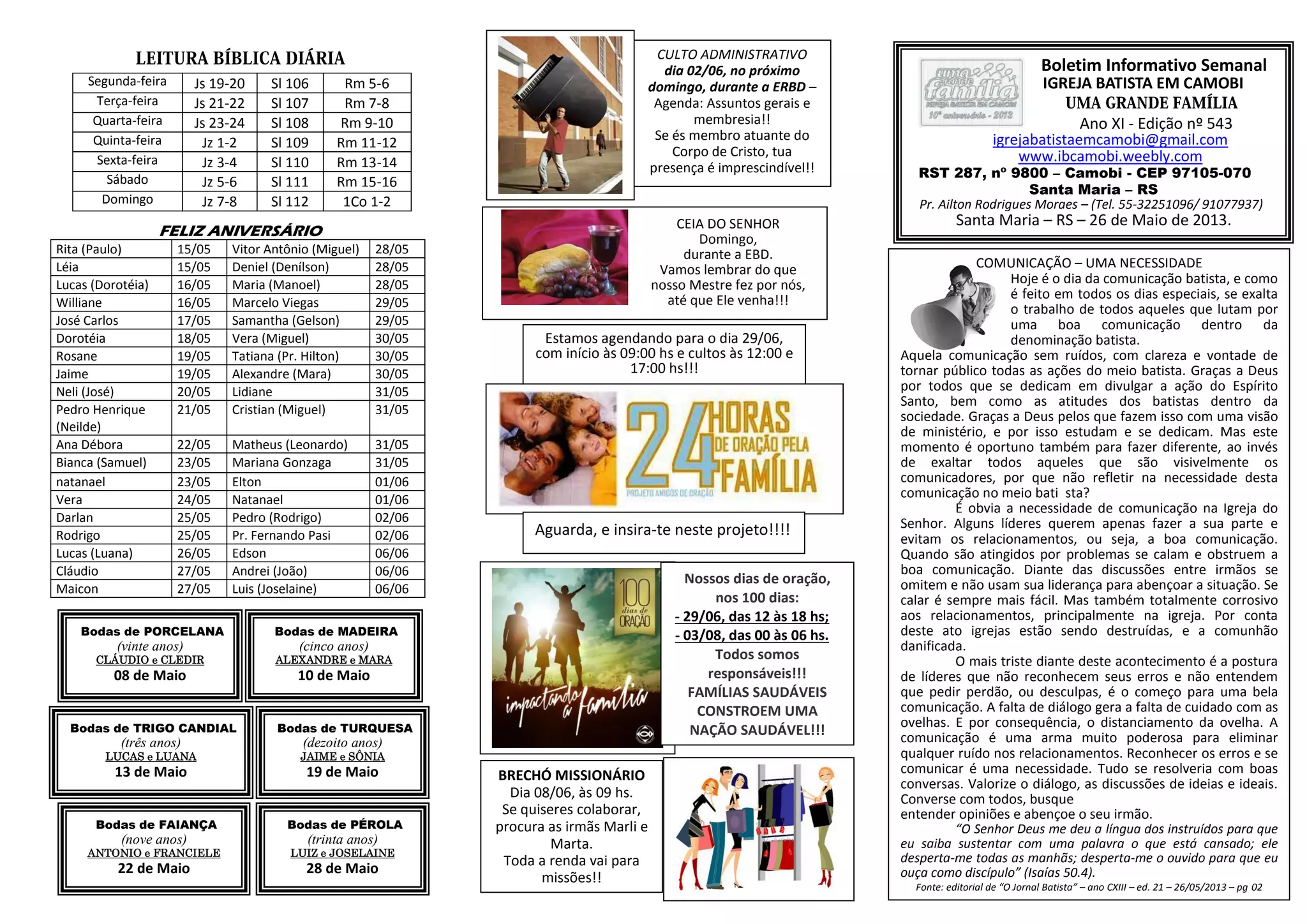 O documento fornece informações sobre eventos semanais em uma igreja batista, incluindo leituras bíblicas diárias, aniversariantes, bodas de casamento, programação de cultos e eventos.