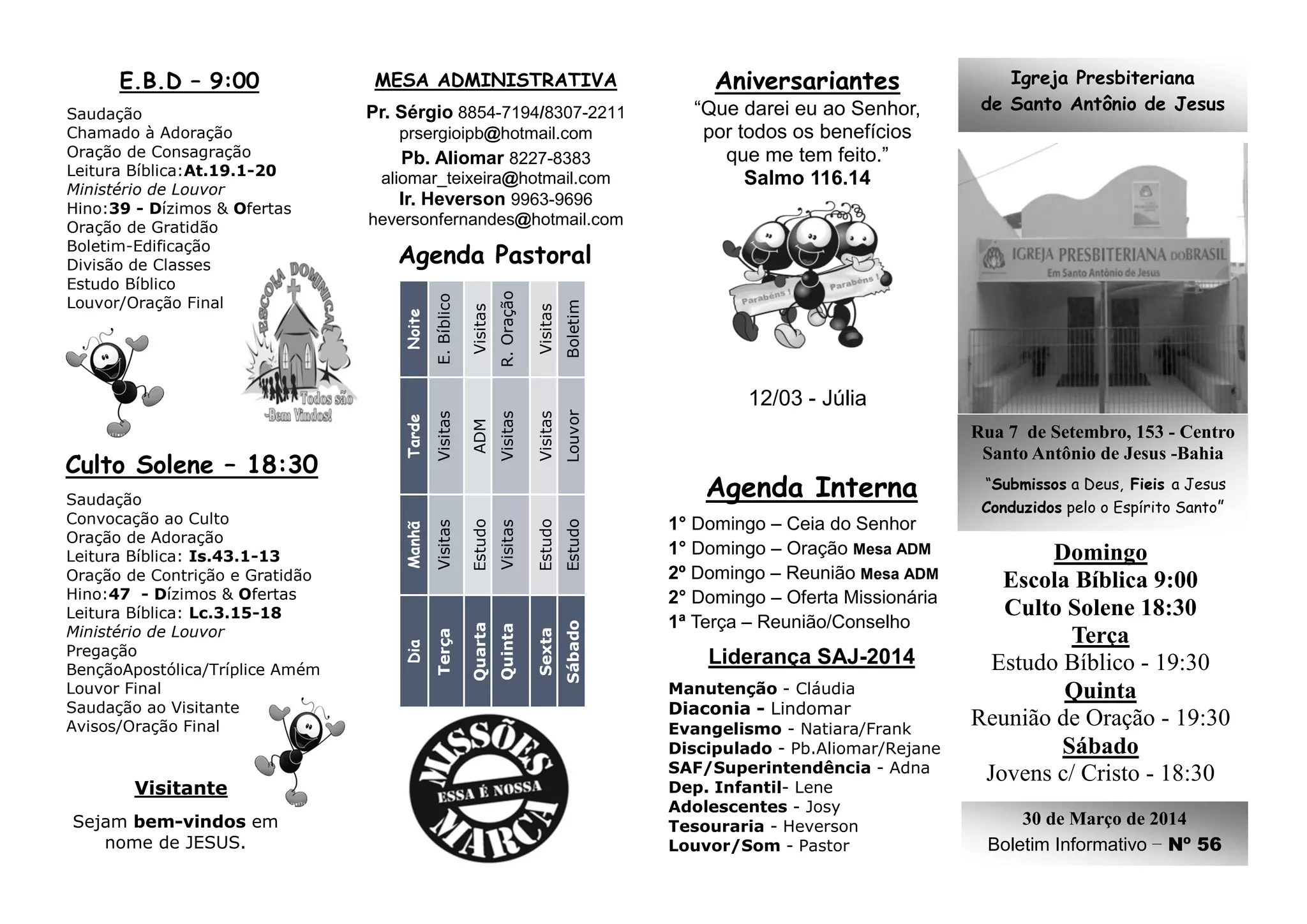 O documento é o boletim informativo da Igreja Presbiteriana de Santo Antônio de Jesus, contendo a agenda de atividades, aniversariantes, avisos, reflexões e orações. A igreja realiza cultos, estudos bíblicos e reuniões de oração durante a semana, além de atividades para jovens e crianças aos fins de semana.