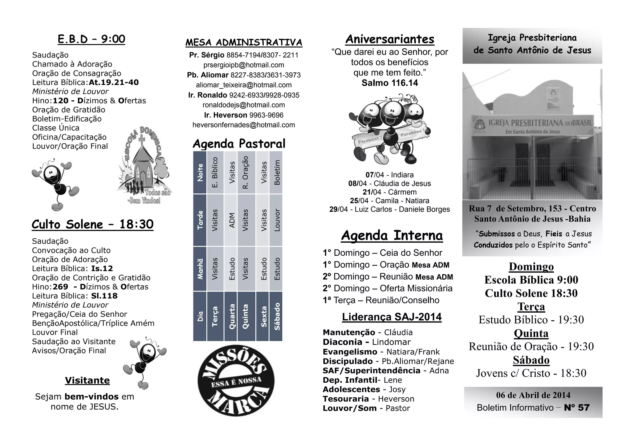 O documento é um boletim informativo de uma igreja presbiteriana em Santo Antônio de Jesus, Bahia. Ele lista os horários de atividades da igreja, aniversariantes do mês, agenda interna, agenda pastoral e avisos. Também inclui a ordem de culto, reflexão semanal, intercessão e bíblia na ponta da língua.