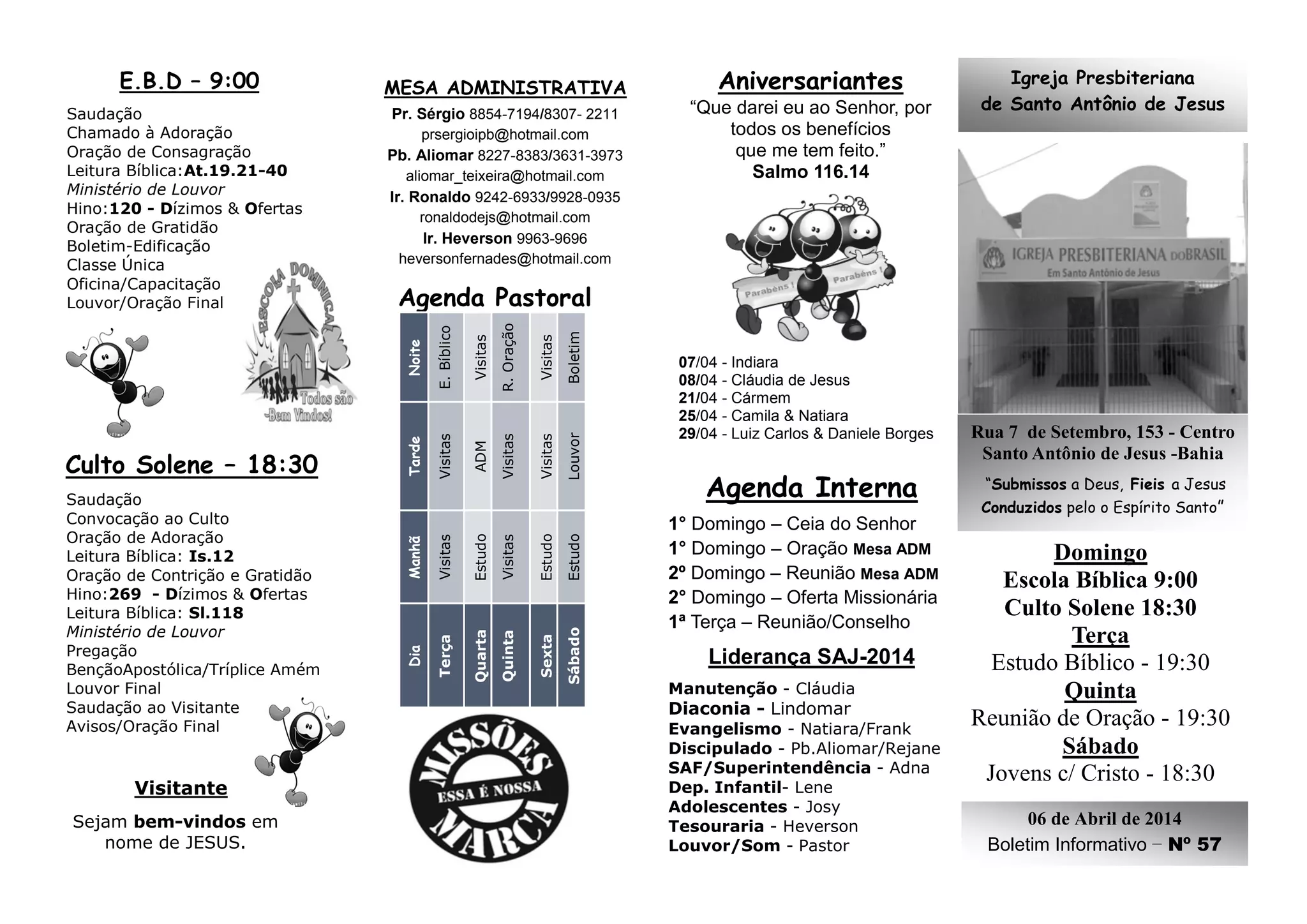 O documento é um boletim informativo da Igreja Presbiteriana de Santo Antônio de Jesus, localizada na Bahia. Ele lista os horários de atividades da igreja, como cultos, estudos bíblicos e reuniões, e anuncia o tema do mês, aniversariantes, agenda pastoral e avisos sobre eventos futuros.
