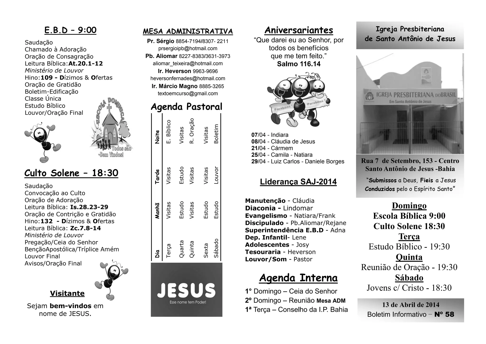 Este boletim informativo descreve os serviços religiosos e eventos de uma igreja presbiteriana em Santo Antônio de Jesus, Bahia, incluindo horários de cultos, estudos bíblicos e reuniões, aniversariantes do mês, liderança da igreja e agenda pastoral.