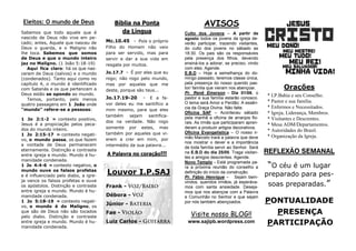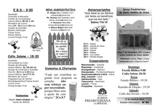 O documento é o boletim informativo da Igreja Presbiteriana de Santo Antônio de Jesus, localizada na Bahia. Ele lista os horários dos cultos e estudos bíblicos durante a semana, aniversariantes do mês, coordenadores de departamentos, avisos sobre eventos futuros e orações.