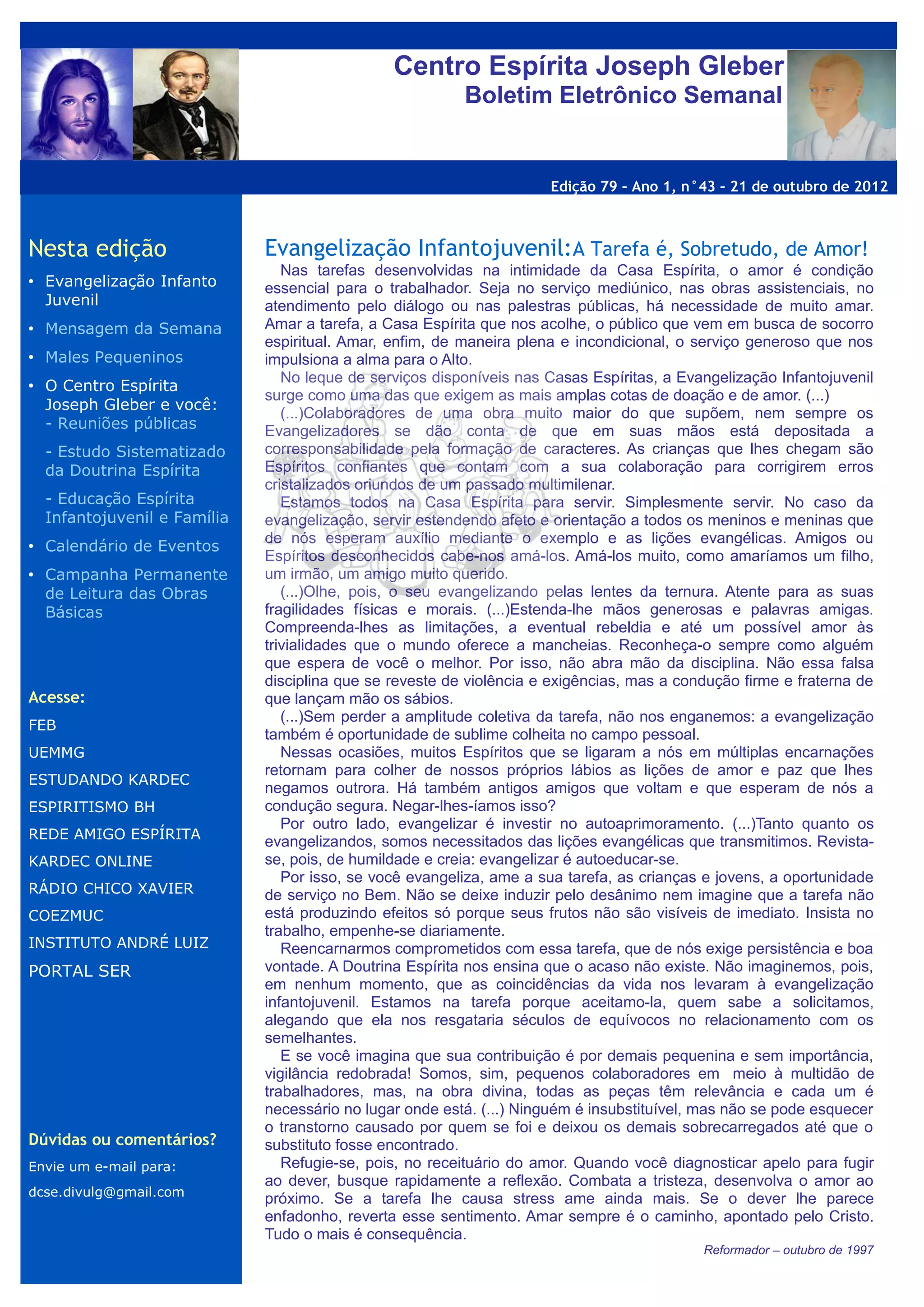 Este boletim eletrônico semanal do Centro Espírita Joseph Gleber discute: