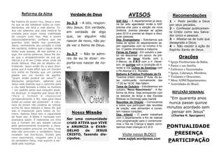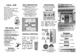 Este boletim informativo fornece detalhes sobre os serviços e eventos da Igreja Presbiteriana de Santo Antônio de Jesus, incluindo horários de cultos, estudos bíblicos e orações durante a semana, aniversariantes do mês, tema do mês de outubro, avisos sobre departamentos e reuniões, e uma reflexão sobre a necessidade do novo nascimento.