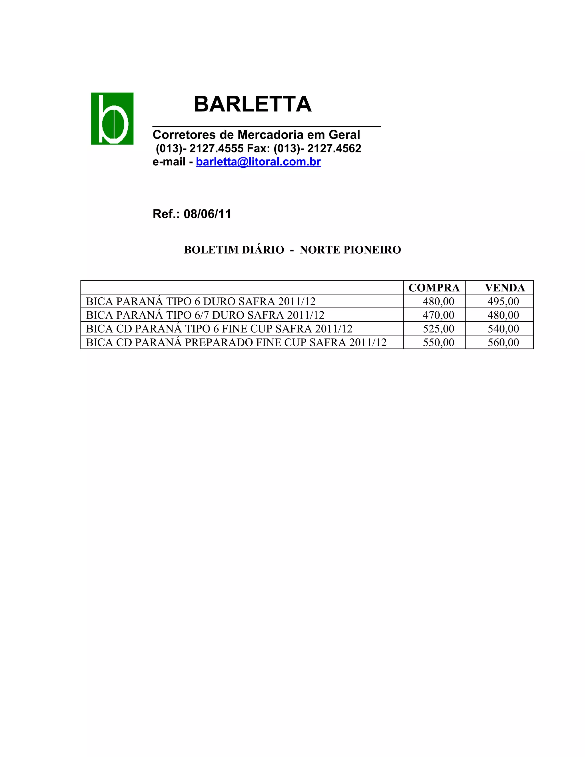 O boletim diário da Barletta apresenta os preços de compra e venda de diferentes tipos de café da safra 2011/12 na região do Norte Pioneiro do Paraná, variando entre R$470,00 a R$560,00.