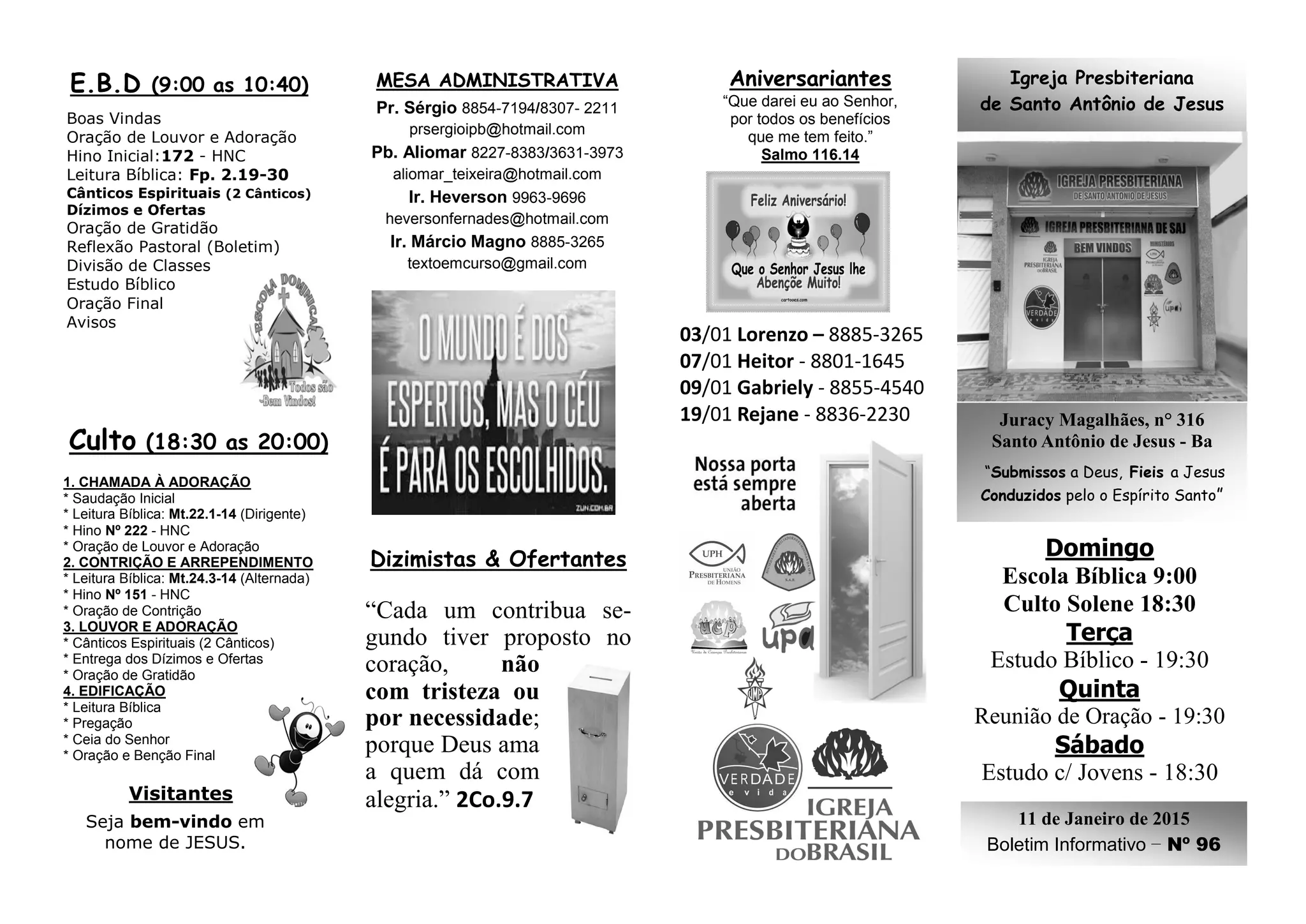 O documento é o boletim informativo da Igreja Presbiteriana de Santo Antônio de Jesus, localizada na Bahia. Ele lista os horários de cultos e estudos bíblicos da igreja, aniversariantes do mês, informações sobre doações e avisos sobre eventos futuros como pregações e reuniões de departamentos.