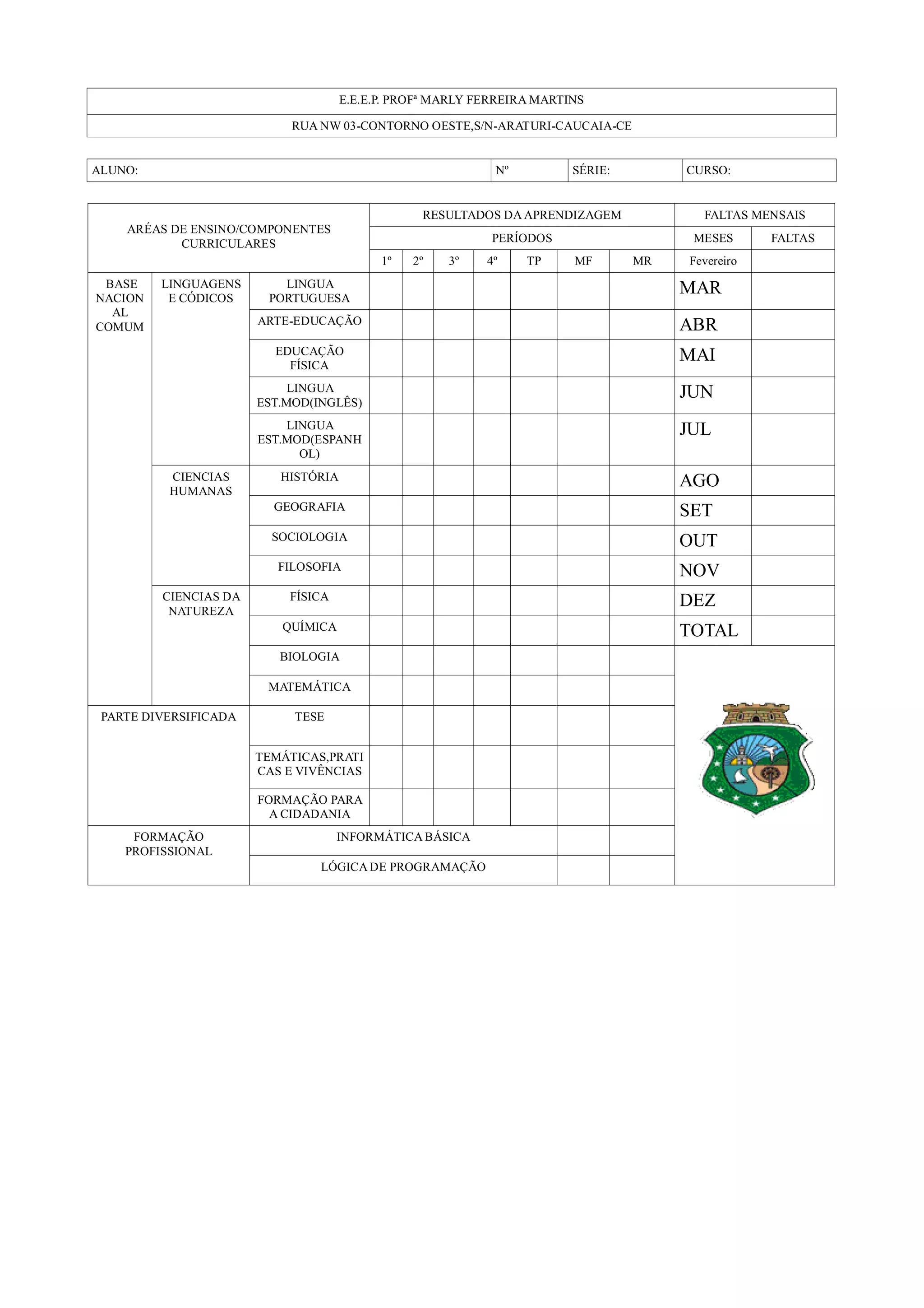 O documento é um boletim escolar de um aluno contendo: 1) as áreas de ensino e componentes curriculares; 2) os resultados da aprendizagem do aluno nos períodos letivos; 3) as faltas mensais do aluno.