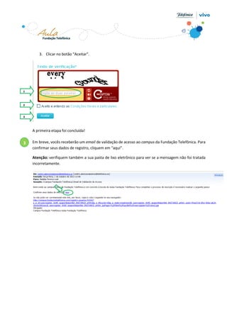 O documento convida gestores e professores a se inscreverem em uma formação online do projeto AFT entre os dias 7 e 18 de outubro. Ele fornece instruções sobre como fazer o cadastro e a inscrição no site da Fundação Telefônica, incluindo preencher um formulário, validar os dados de acesso por e-mail e acessar a área de formação.