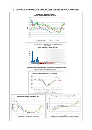 O boletim descreve as condições climáticas e níveis de pragas e doenças em três regiões cafeeiras em agosto de 2016. As temperaturas foram próximas à média histórica, mas a umidade foi baixa. As chuvas foram abaixo do necessário, aumentando os déficits hídricos. Em Araguari, 38% das folhas apresentavam ferrugem e 74% minas de bicho mineiro; 48% tinham ácaros. Monitoramento contínuo é essencial para gerenciar pragas e irrig