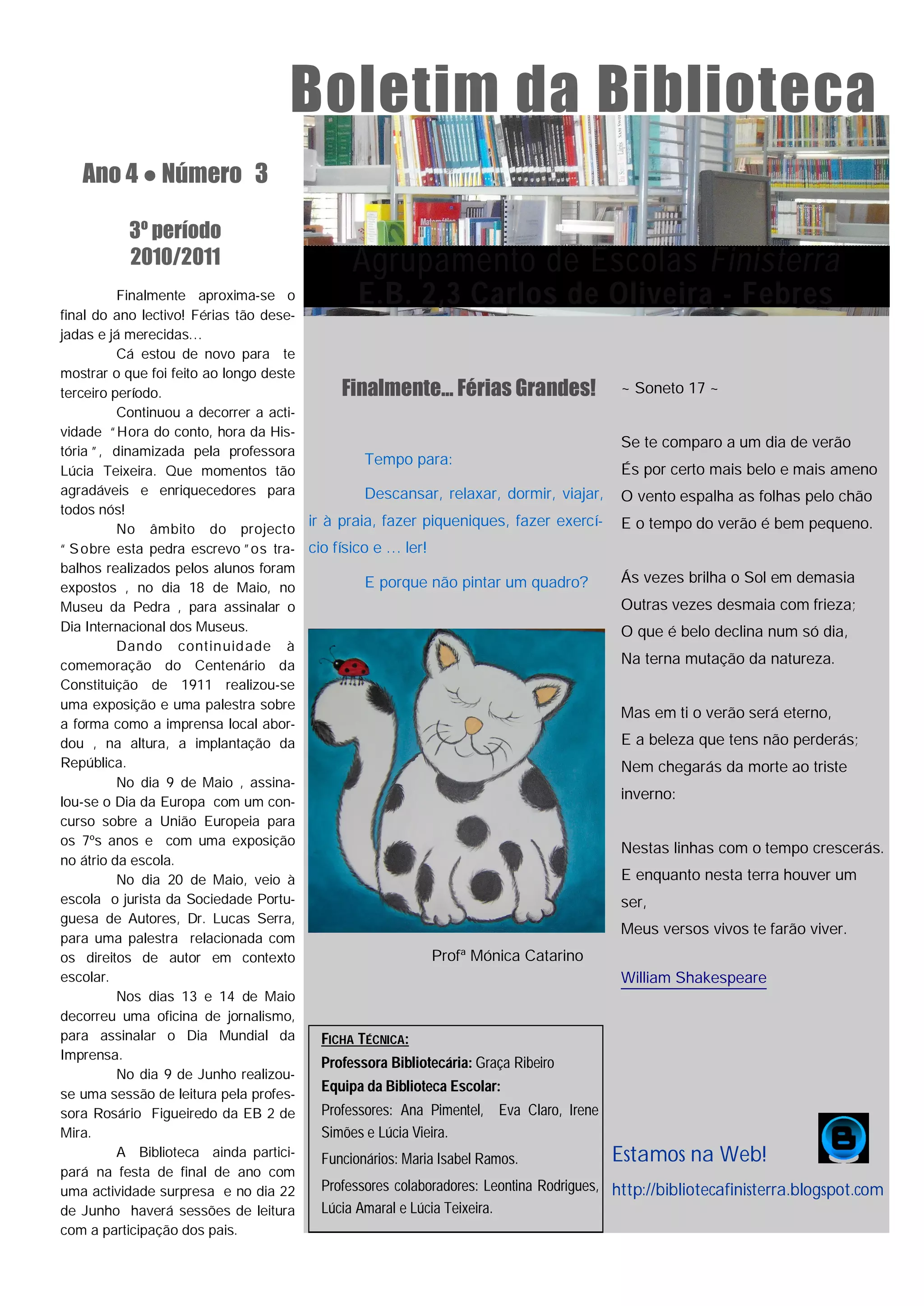 O boletim da biblioteca descreve as atividades realizadas no terceiro período letivo, incluindo a hora do conto com histórias, uma exposição dos trabalhos dos alunos, e palestras sobre direitos autorais e a constituição portuguesa de 1911. As férias de verão estão quase a começar.