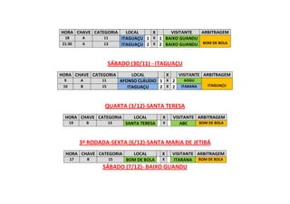 O documento lista os jogos e resultados da Liga Serrana Infantil de 2013, incluindo as categorias sub-11, sub-13 e sub-15. Nele constam as rodadas classificatórias, semifinais e finais realizadas em diversas cidades, além dos artilheiros, goleiros e equipes premiadas ao final da competição.