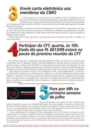 O documento resume 5 maneiras para manter a mobilização pela aprovação do PL 6613/2009, que trata da carreira dos servidores do Poder Judiciário, incluindo distribuir adesivos de carro, solicitar informações sobre as negociações por meio da Lei de Acesso à Informação, enviar cartas eletrônicas aos membros da Comissão Mista de Orçamento, participar da reunião da Comissão de Trabalho, Família e Serviço Público na quarta-feira e paralisar as atividades por 48 horas na primeira semana de j