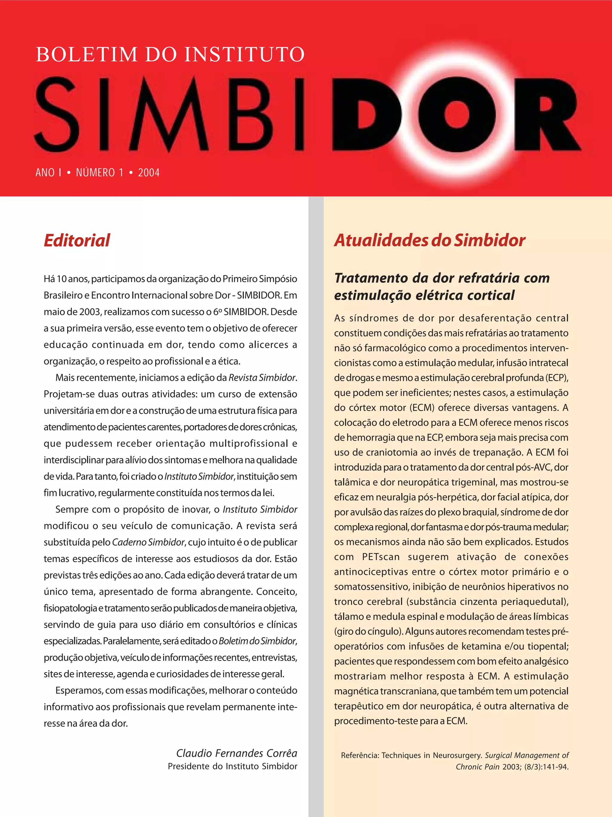1) O documento descreve as atividades e objetivos do Instituto Simbidor, que organiza eventos sobre dor e oferece educação continuada nessa área. 2) Recentemente, o Instituto iniciou uma revista e modificou seu formato de comunicação, substituindo a revista por um caderno para publicar temas específicos sobre dor. 3) O documento também discute técnicas de estimulação elétrica cortical para tratamento de dores refratárias.