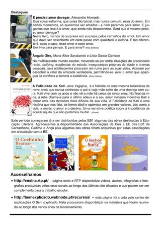 O boletim destaca eventos como o ateliê "tapetes contadores de histórias" e a fase escolar do concurso nacional de leitura, onde alunos se classificaram para a etapa regional. Além disso, menciona a ida ao teatro para assistir à peça "auto da barca do inferno" e apresenta resumos de obras literárias como "a felicidade de kati" e outras. O documento também recomenda recursos educacionais online para complementar o aprendizado escolar.