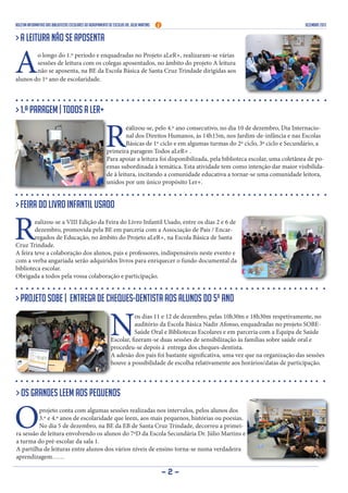 Este boletim informativo descreve as atividades realizadas pelas bibliotecas escolares do Agrupamento de Escolas Dr. Júlio Martins no mês de dezembro, incluindo a participação na Maratona de Cartas da Anistia Internacional, leituras compartilhadas com idosos em um lar de idosos, e a Feira do Livro Infantil Usado.