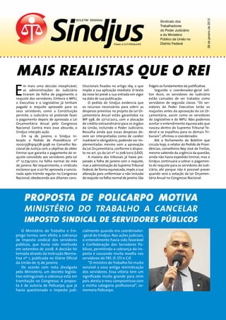 O boletim semanal do Sindjus relata que: (1) o sindicato interpôs ação contra o Judiciário para garantir o pagamento do reajuste salarial de janeiro; (2) o Ministério do Trabalho cancelou a cobrança do imposto sindical de servidores públicos após proposta de um membro do sindicato; (3) o Sindjus entrará com ações para corrigir distorções no cálculo da GAJ e da GAMPU.