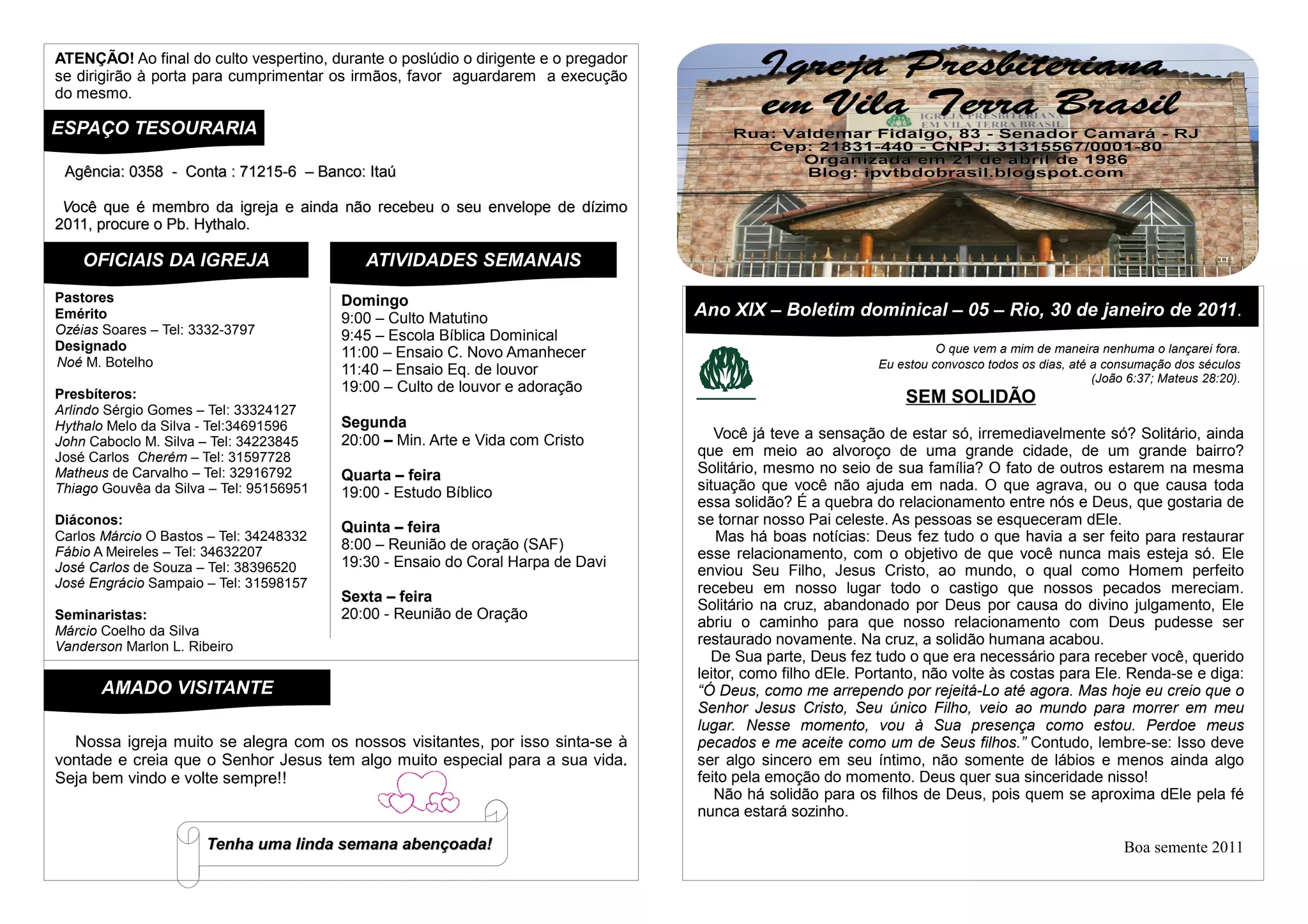 Emérito 9:00 – Culto Matutino Ano XIX – Boletim dominical – 05 – Rio, 30 de janeiro de 2011.