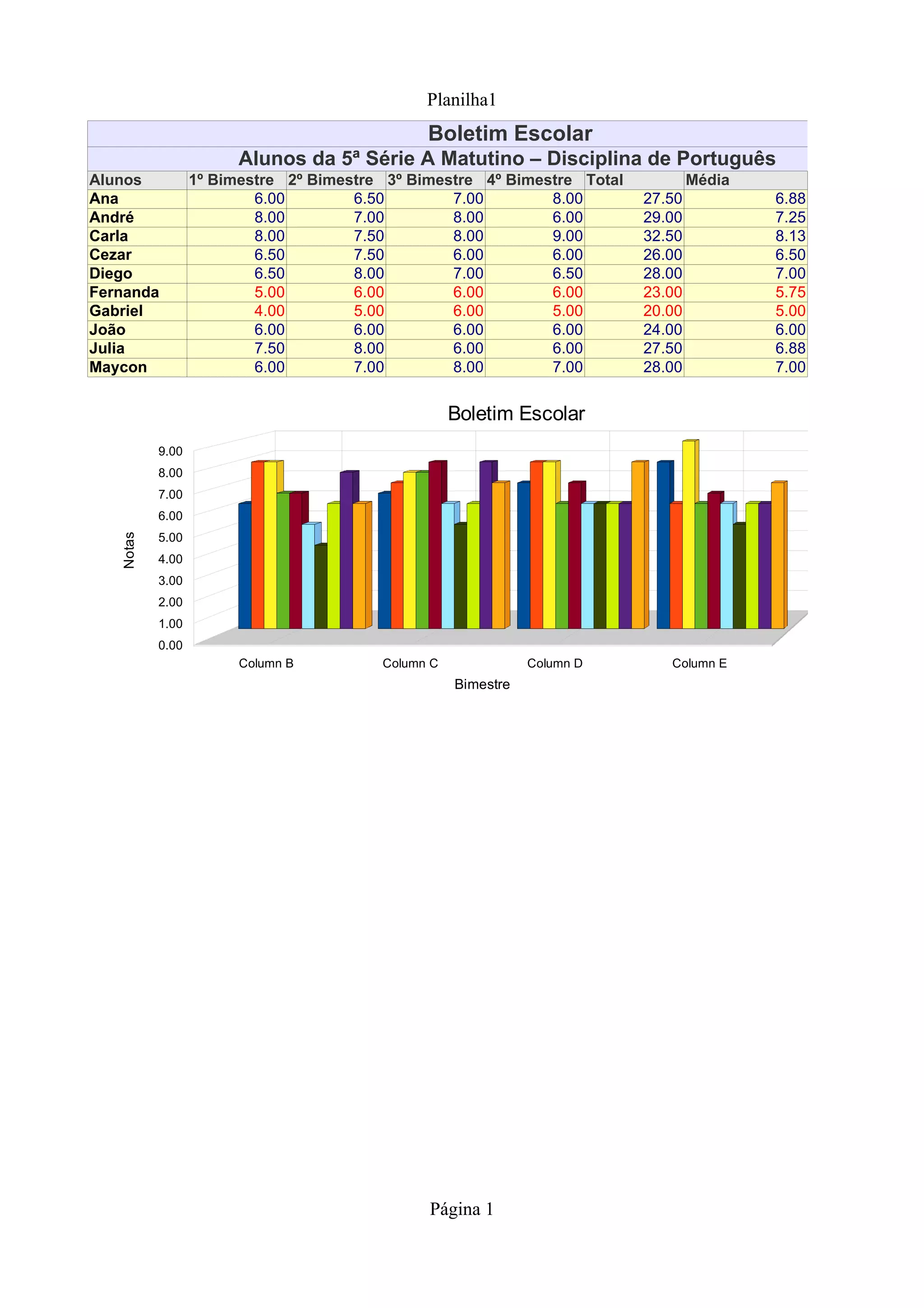 Alunos 1º Bimestre 2º Bimestre 3º Bimestre 4º Bimestre Total Média