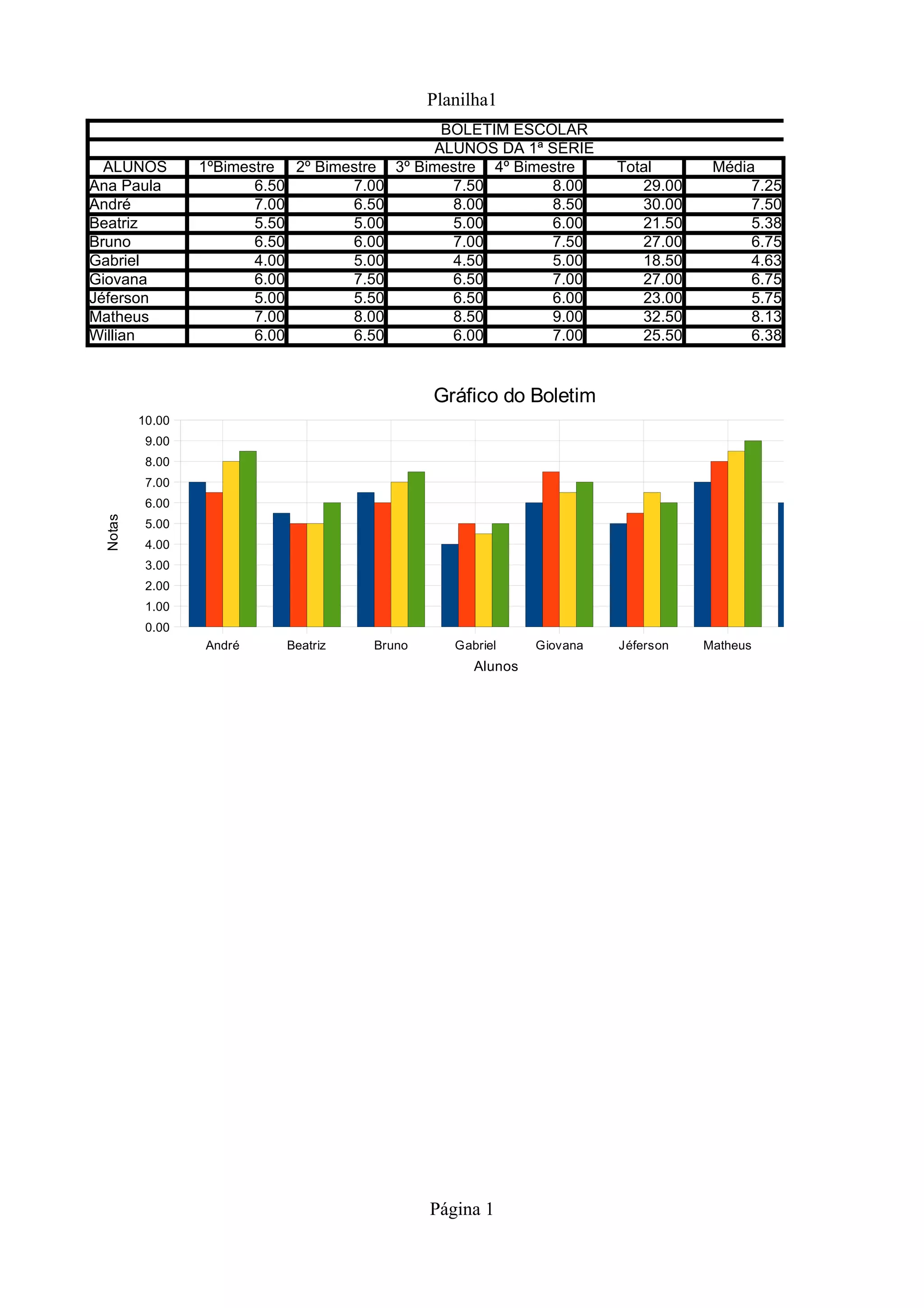 O documento apresenta o boletim escolar de alunos da 1a série com suas notas nos 4 bimestres, média final e situação (aprovado/reprovado). O aluno Matheus obteve as maiores notas, com média 8,13, enquanto Beatriz obteve as menores, com média 5,38, sendo reprovada.