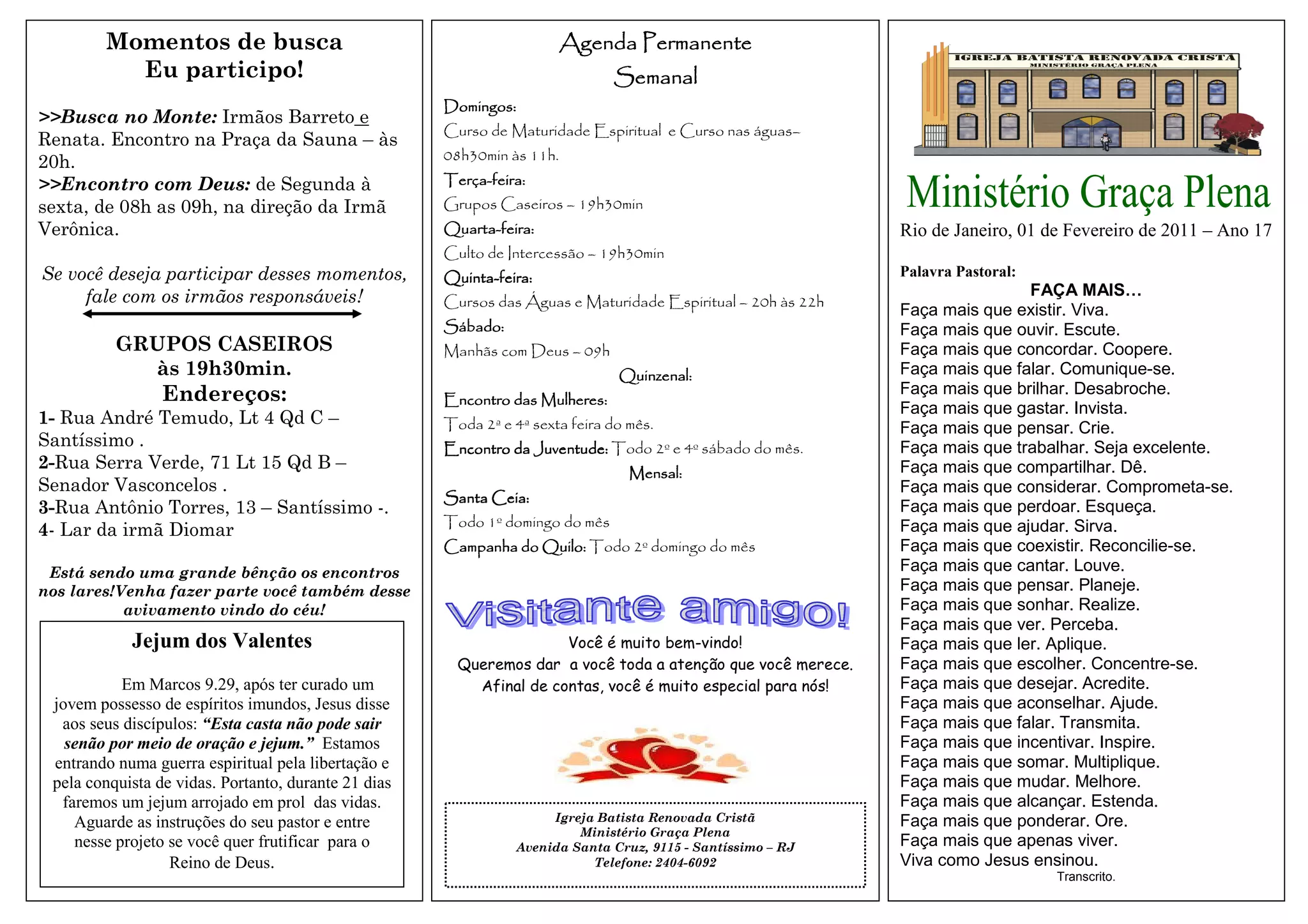 2) Também fornece informações sobre uma campanha de jejum, a biblioteca da igreja, e detalhes sobre uma festa de aniversário de um ministério feminino.