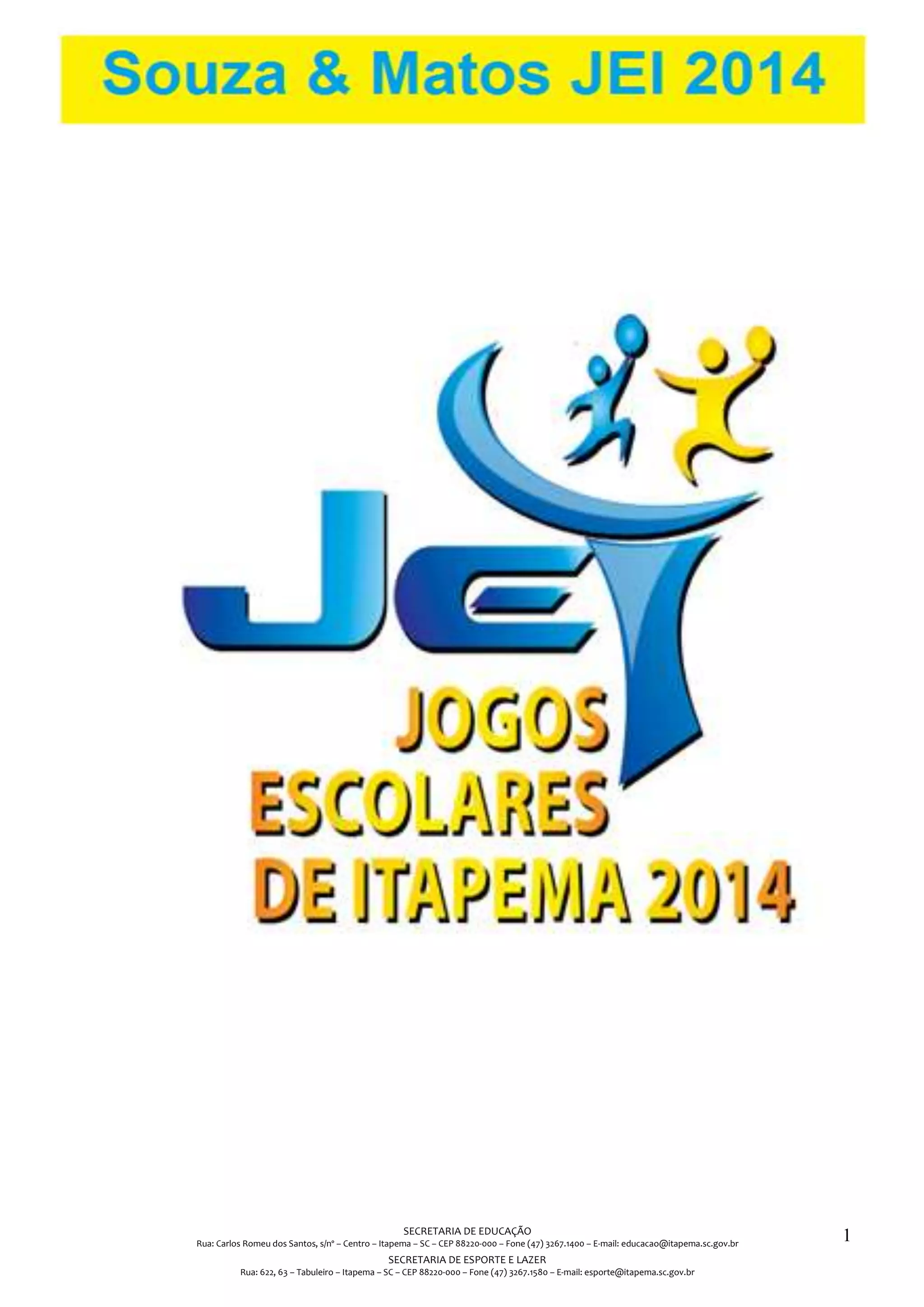 Este documento fornece os resultados de competições esportivas realizadas em 11 de agosto de 2014 na cidade de Itapema, Santa Catarina. Contém informações sobre voleibol, handebol e vôlei de praia infantil e juvenil feminino e masculino, incluindo jogos, classificações e campeões.