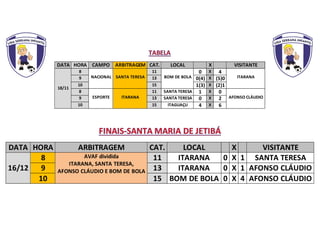 O documento apresenta resultados de jogos de futebol entre equipes de Santa Teresa, Itarana, Afonso Cláudio e Bom de Bola. É mostrada a pontuação geral com Afoso Cláudio em primeiro, Santa Teresa em segundo e Itarana em terceiro. Também são listados dados individuais de jogadores como gols e cartões recebidos.