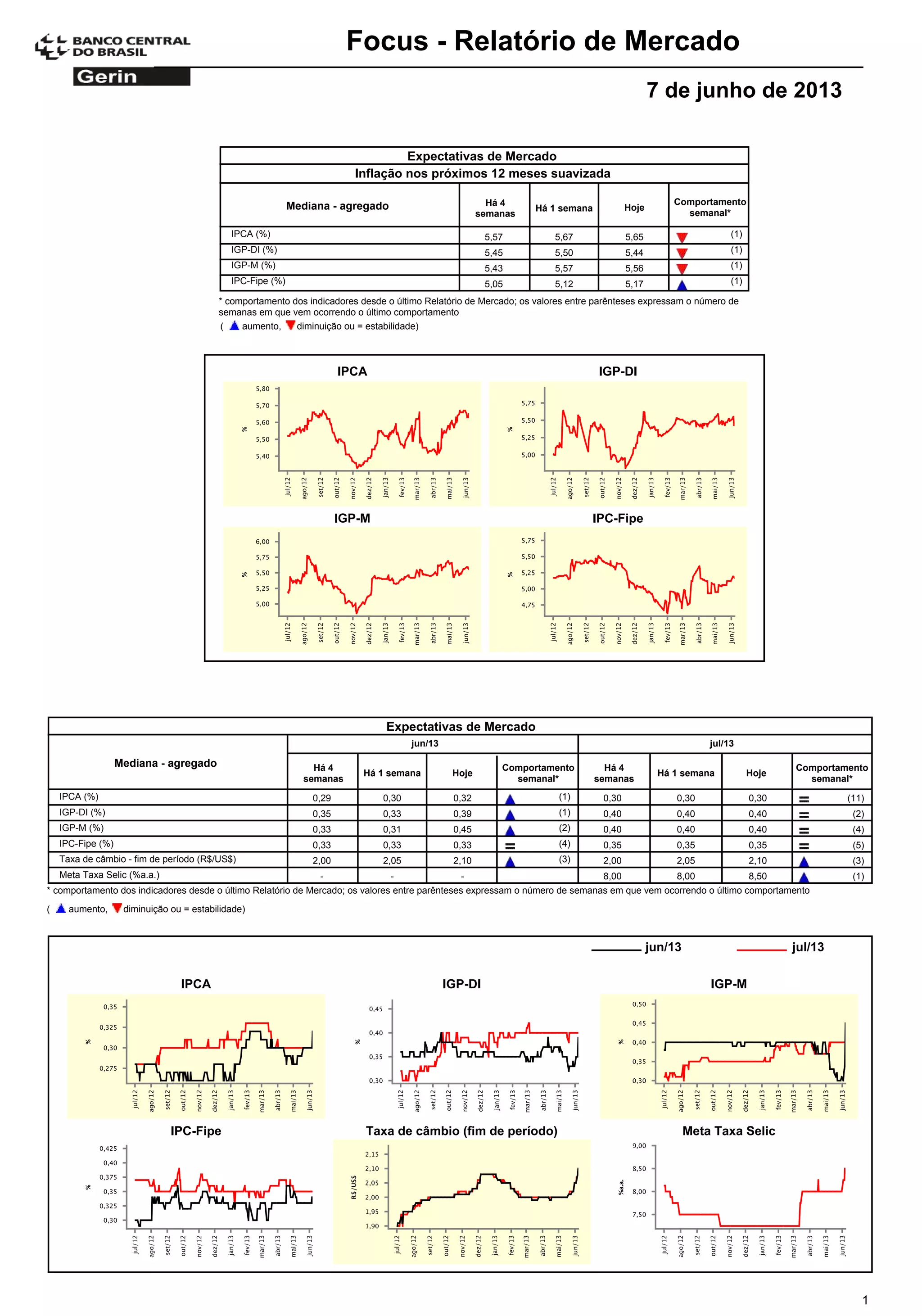 O relatório apresenta as expectativas de mercado para indicadores econômicos brasileiros como inflação, câmbio e taxa de juros. Os dados mostram as medianas e comportamentos semanais destes indicadores para os próximos meses e anos de acordo com as previsões de analistas.