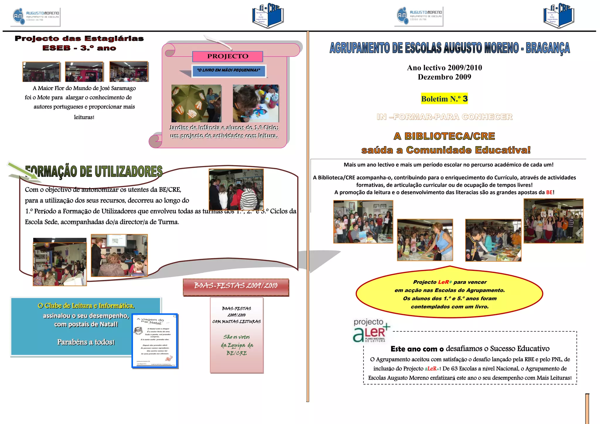 Este documento resume as atividades realizadas pela biblioteca escolar nos primeiros meses do ano letivo de 2009/2010, incluindo a formação de alunos para o uso dos recursos, o projeto de leitura LeR+ e atividades conjuntas com outros agrupamentos para promover a leitura.