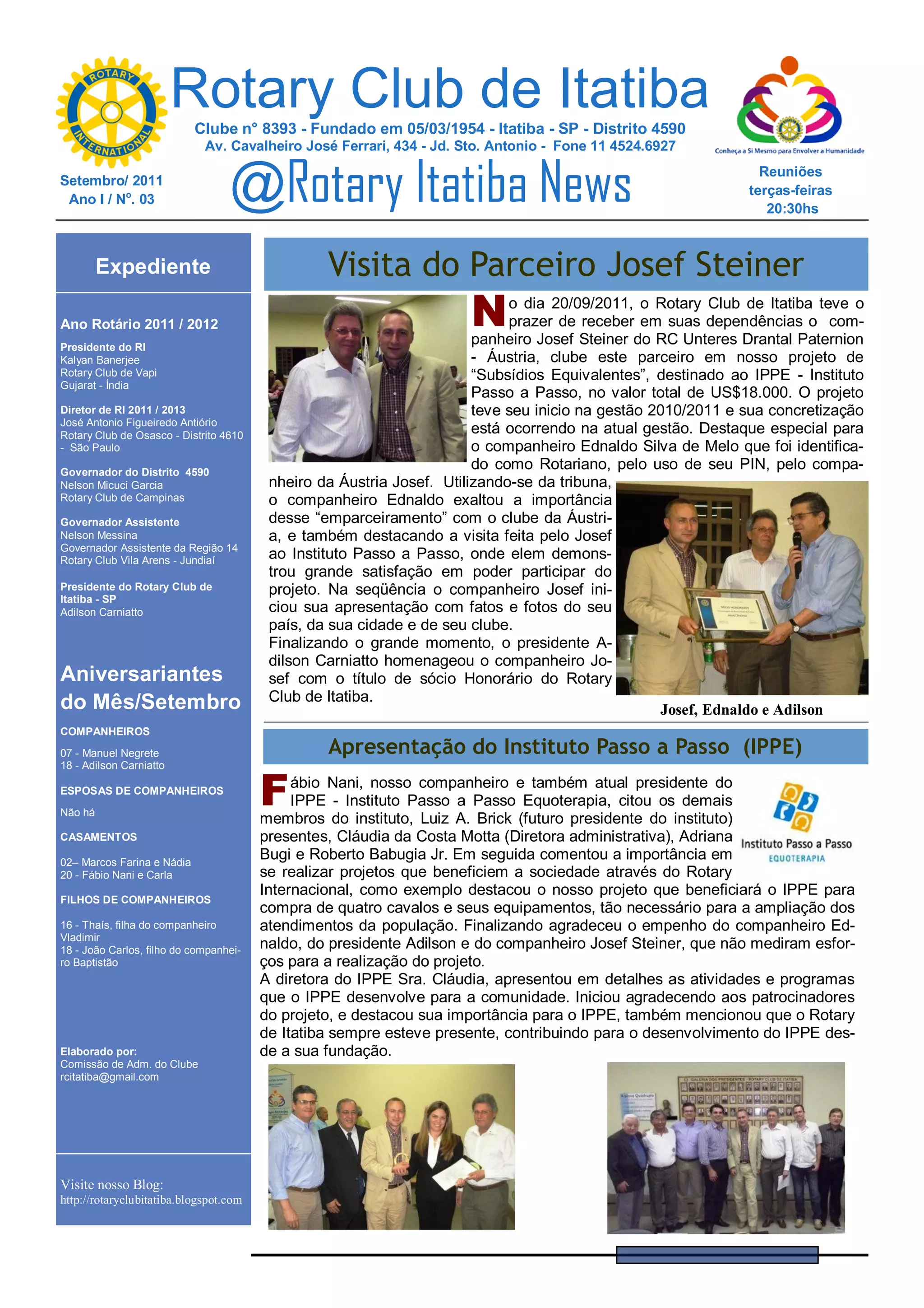 O Rotary Club de Itatiba recebeu o parceiro Josef Steiner da Áustria para discutir o projeto de "Subsídios Equivalentes" no valor de US$18.000 destinado ao Instituto Passo a Passo. O IPPE apresentou suas atividades e programas e agradeceu o apoio do Rotary Club de Itatiba. O governador eleito 2012/2013 Paulo Celso Motta convidou o companheiro Flávio Falango para ser Governador Assistente da região 14.