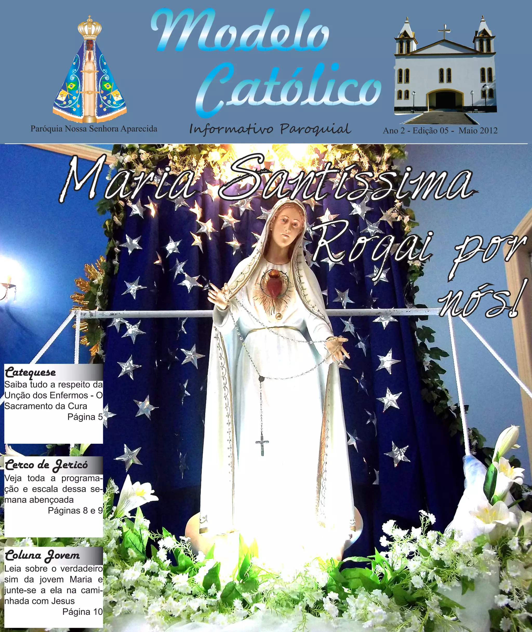 1) O informativo paroquial descreve os eventos do mês de maio na Paróquia Nossa Senhora Aparecida, incluindo o Cerco de Jericó e a coluna para jovens.