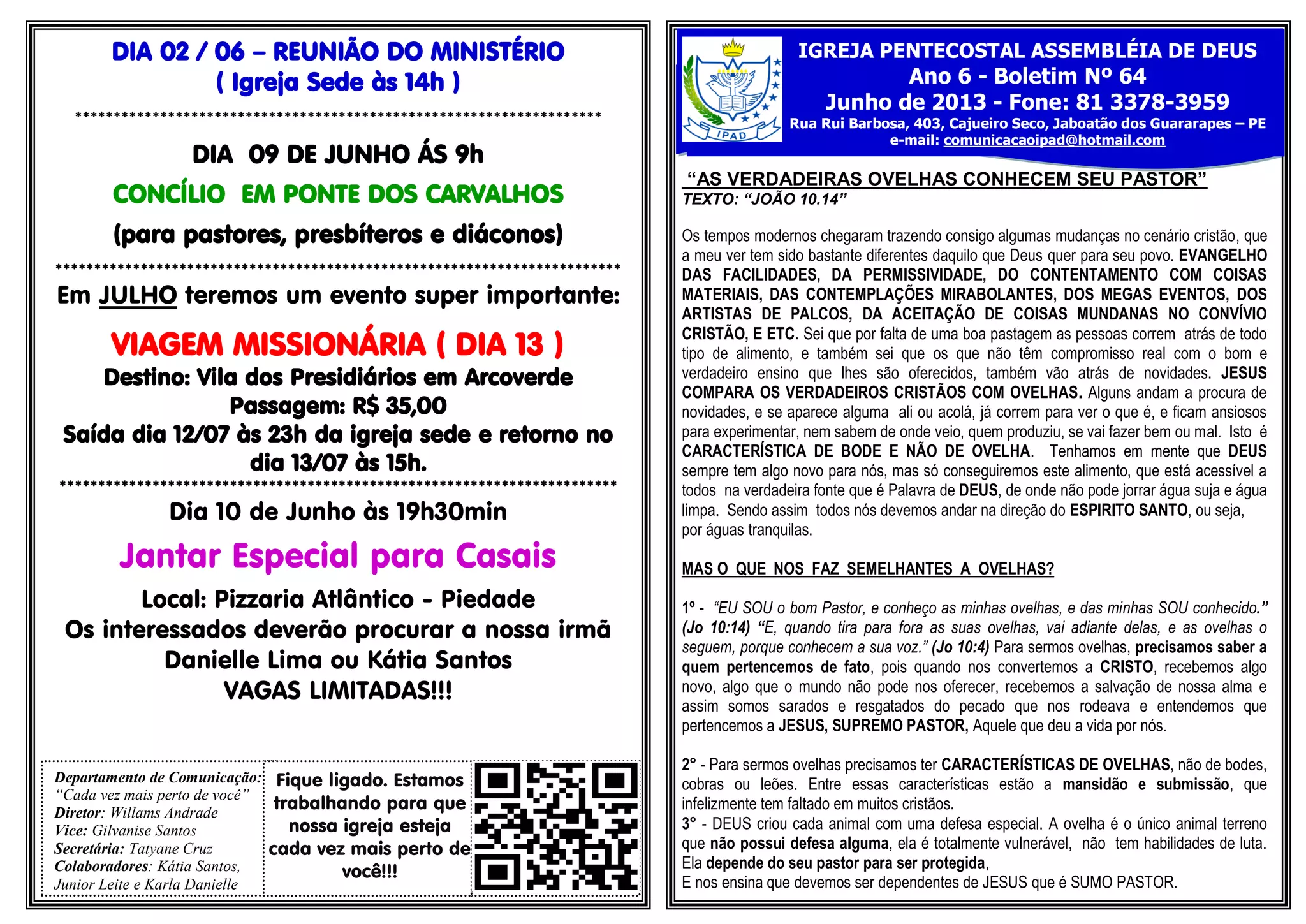 1) Reunião do ministério em 2 de junho e concílio em 9 de junho para pastores, presbíteros e diáconos;