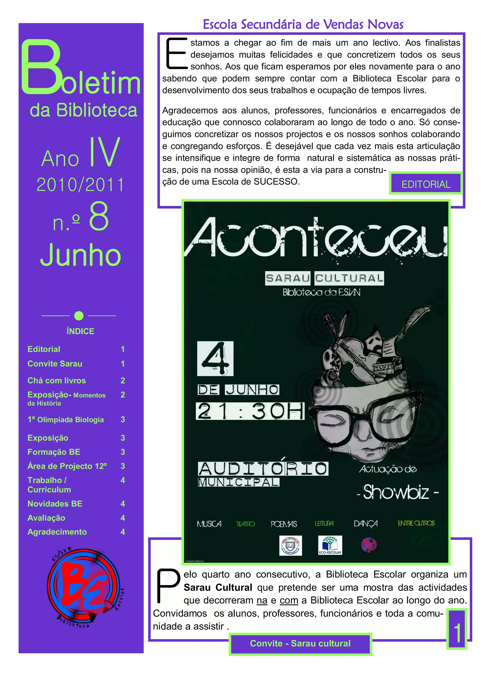1) A Biblioteca Escolar organiza um Sarau Cultural para mostrar as atividades do ano letivo e convida a comunidade.