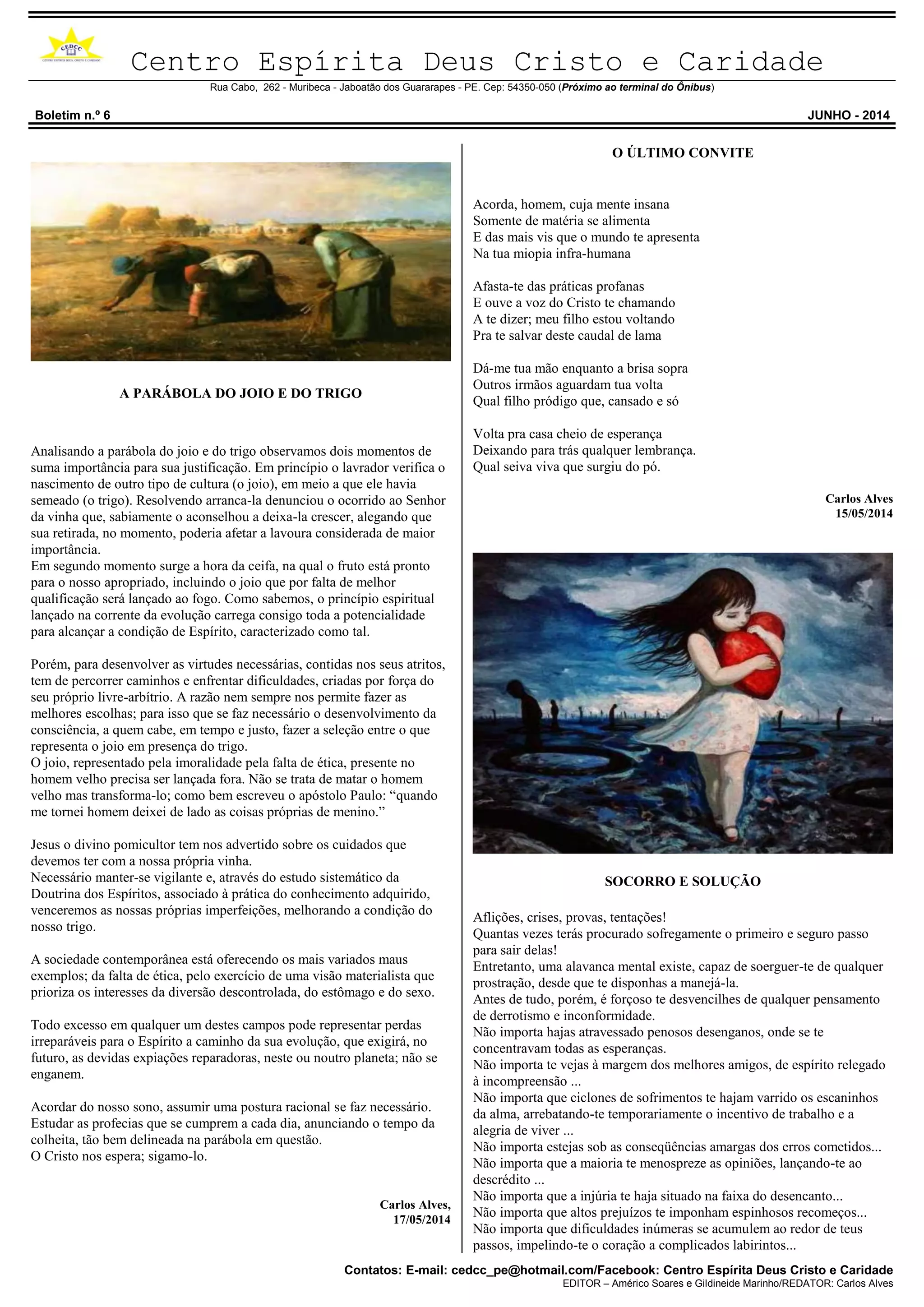 O documento resume três artigos publicados no boletim de um centro espírita em junho de 2014. O primeiro artigo analisa a parábola bíblica do joio e do trigo. O segundo é um poema sobre o convite de Cristo para a redenção. O terceiro fala sobre encontrar forças na fé para superar provações.