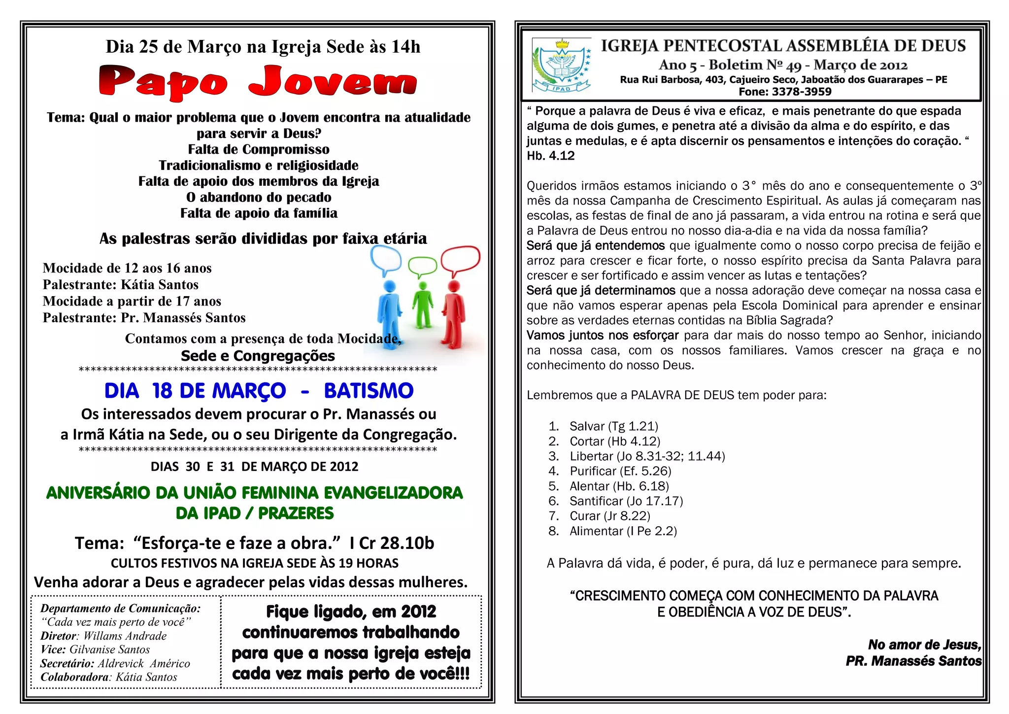 2) O tema principal do próximo culto é sobre os desafios que os jovens enfrentam hoje para servir a Deus, com palestrantes abordando diferentes faixas etárias.