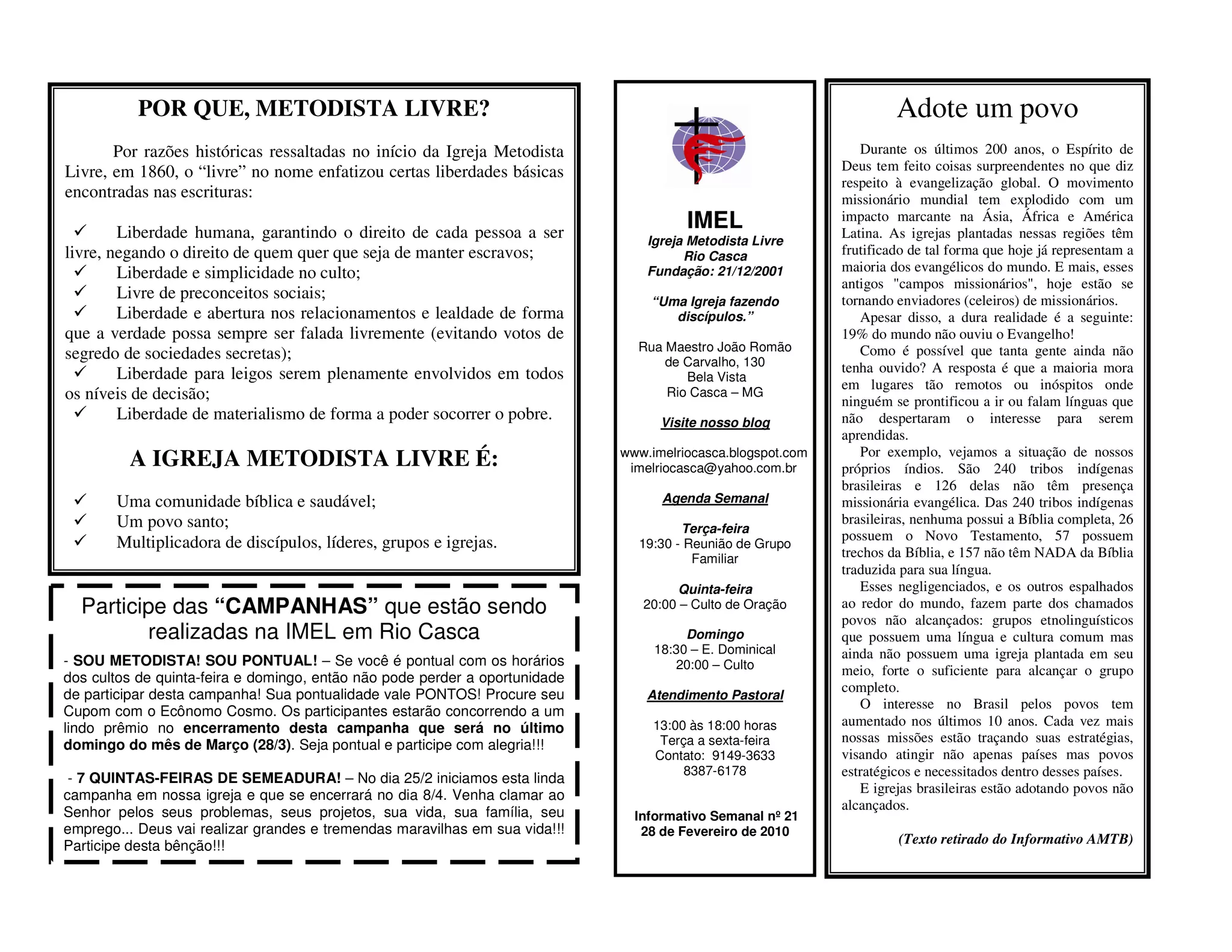 O documento discute a importância de alcançar povos não evangelizados, destacando que 19% da população mundial ainda não ouviu o evangelho. Menciona que muitos povos indígenas brasileiros não têm a Bíblia traduzida ou presença missionária, e que igrejas brasileiras estão adotando povos para evangelizá-los. Também anuncia campanhas da Igreja Metodista Livre de Rio Casca para arrecadação de fundos e oração.