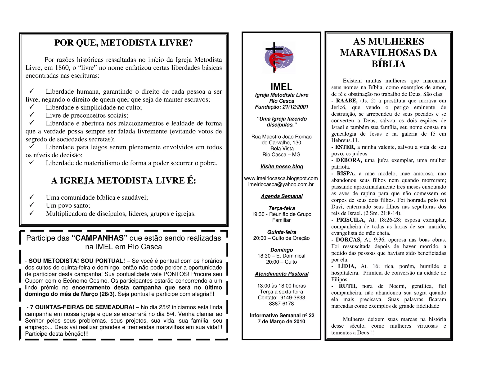 Este documento fornece informações sobre a Igreja Metodista Livre em Rio Casca, incluindo sua história, crenças, eventos e membros. Resume as principais atividades da igreja como campanhas de pontualidade e oração, além de fornecer detalhes sobre o relatório financeiro e escalas de serviço.