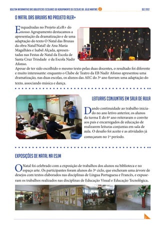 Este boletim informativo das bibliotecas escolares do Agrupamento de Escolas Dr. Júlio Martins resume vários eventos realizados em dezembro, incluindo uma dramatização sobre a Restauração da Independência, atividades para assinalar o Dia Internacional dos Direitos Humanos, e apresentações de Natal nas escolas do agrupamento.