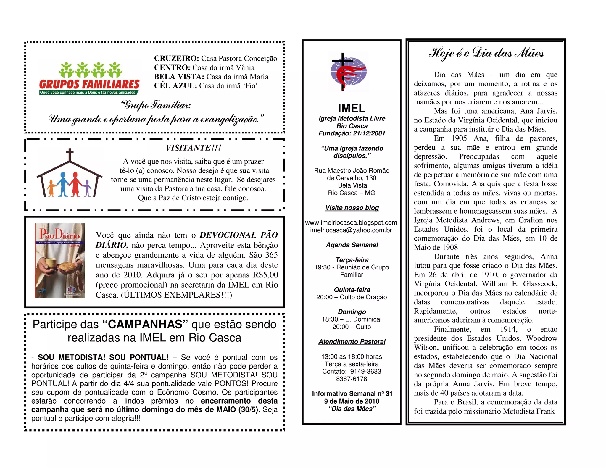 O documento anuncia várias atividades e eventos ocorrendo na Igreja Metodista Livre em Rio Casca, como uma campanha de pontualidade, visitas pastorais, disponibilidade do livro "Pão Diário", e escalas para o grupo de louvor e lanches da Escola Dominical.