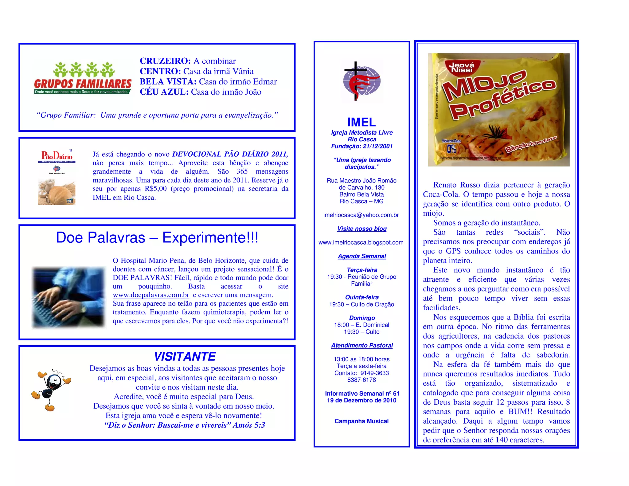 2) Inclui também informações sobre um devocional para 2011 e sobre um projeto no Hospital Mario Pena chamado "Doe Palavras".