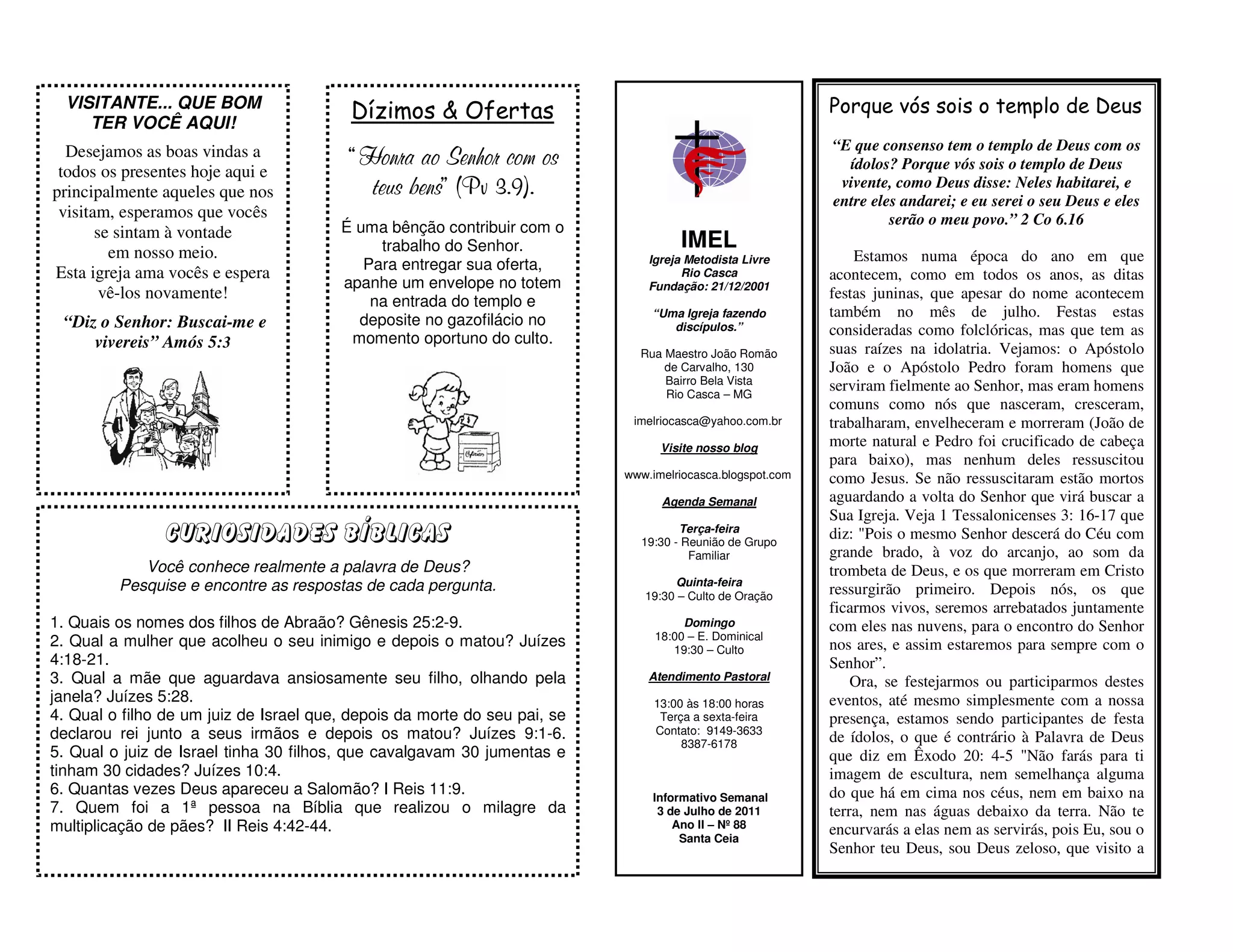 A igreja dá as boas-vindas aos visitantes e espera vê-los novamente. É uma bênção contribuir com o trabalho do Senhor através de dízimos e ofertas. O documento alerta que participar de festas juninas é idolatria segundo a Bíblia e orienta os membros a se absterem delas.