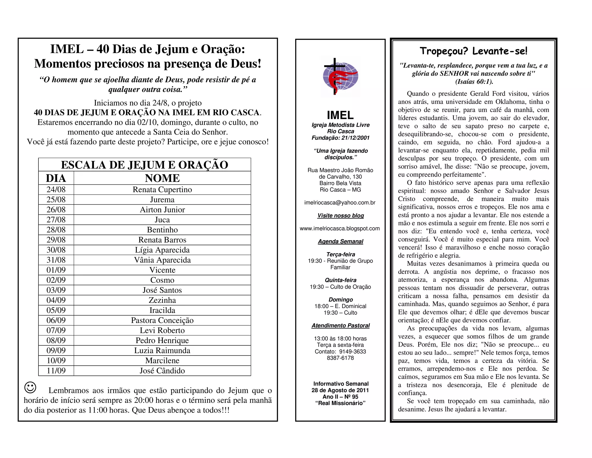 Este documento resume um projeto de 40 dias de jejum e oração na Igreja Metodista Livre de Rio Casca (IMEL). O projeto começou em 24 de agosto e terminará em 2 de outubro, durante o culto dominical que antecederá a Santa Ceia. O documento lista os nomes das pessoas que participarão do jejum diário e contém reflexões sobre como Jesus compreende nossos erros e nos ajuda a levantar quando tropeçamos.