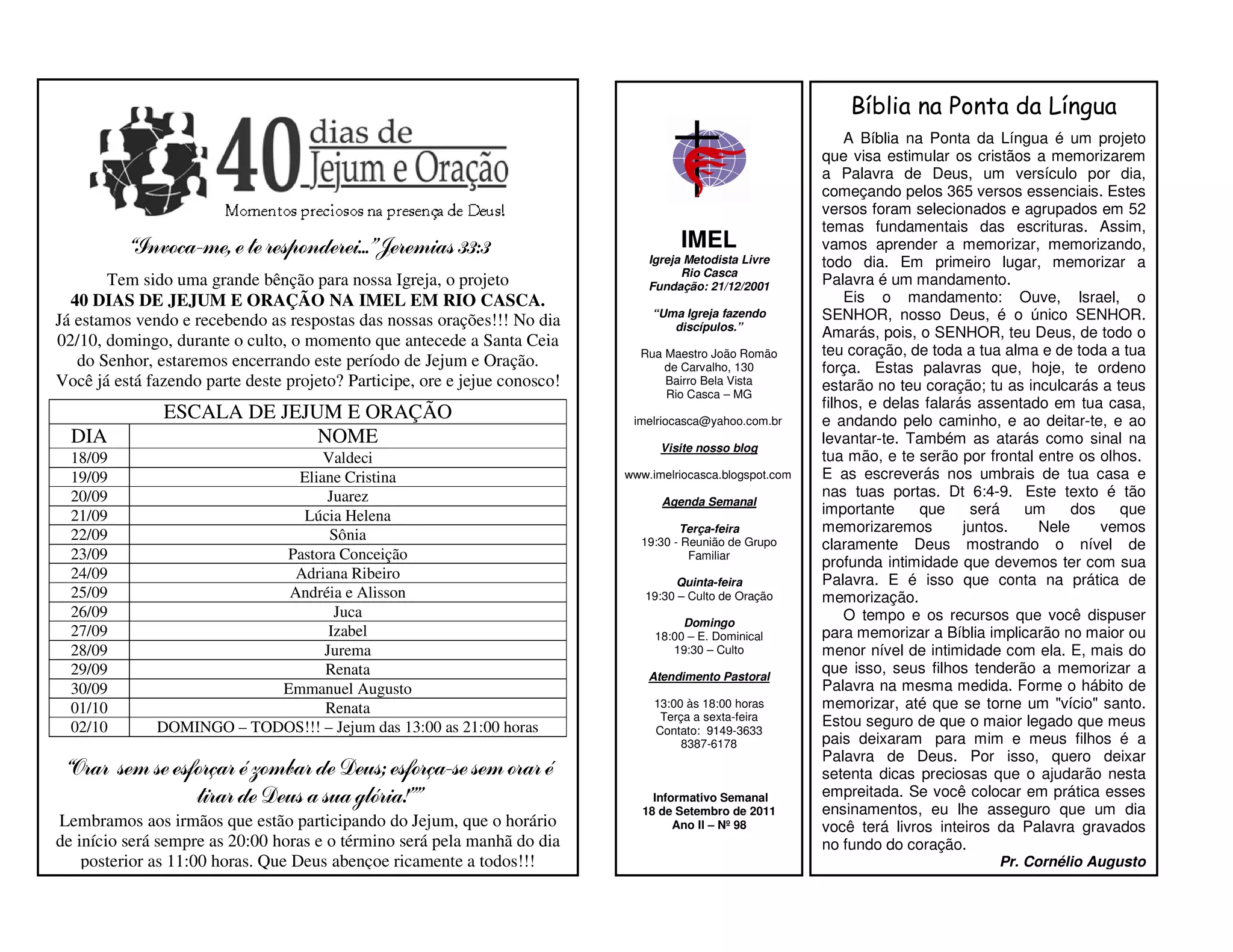 O documento descreve um projeto da Igreja Metodista Livre em Rio Casca chamado "A Bíblia na Ponta da Língua" que visa estimular os cristãos a memorizarem um versículo bíblico por dia, começando por 365 versos essenciais agrupados em 52 temas. O projeto começou em setembro e inclui informações sobre cultos, visitas do bispo e escalas de jejum e oração.