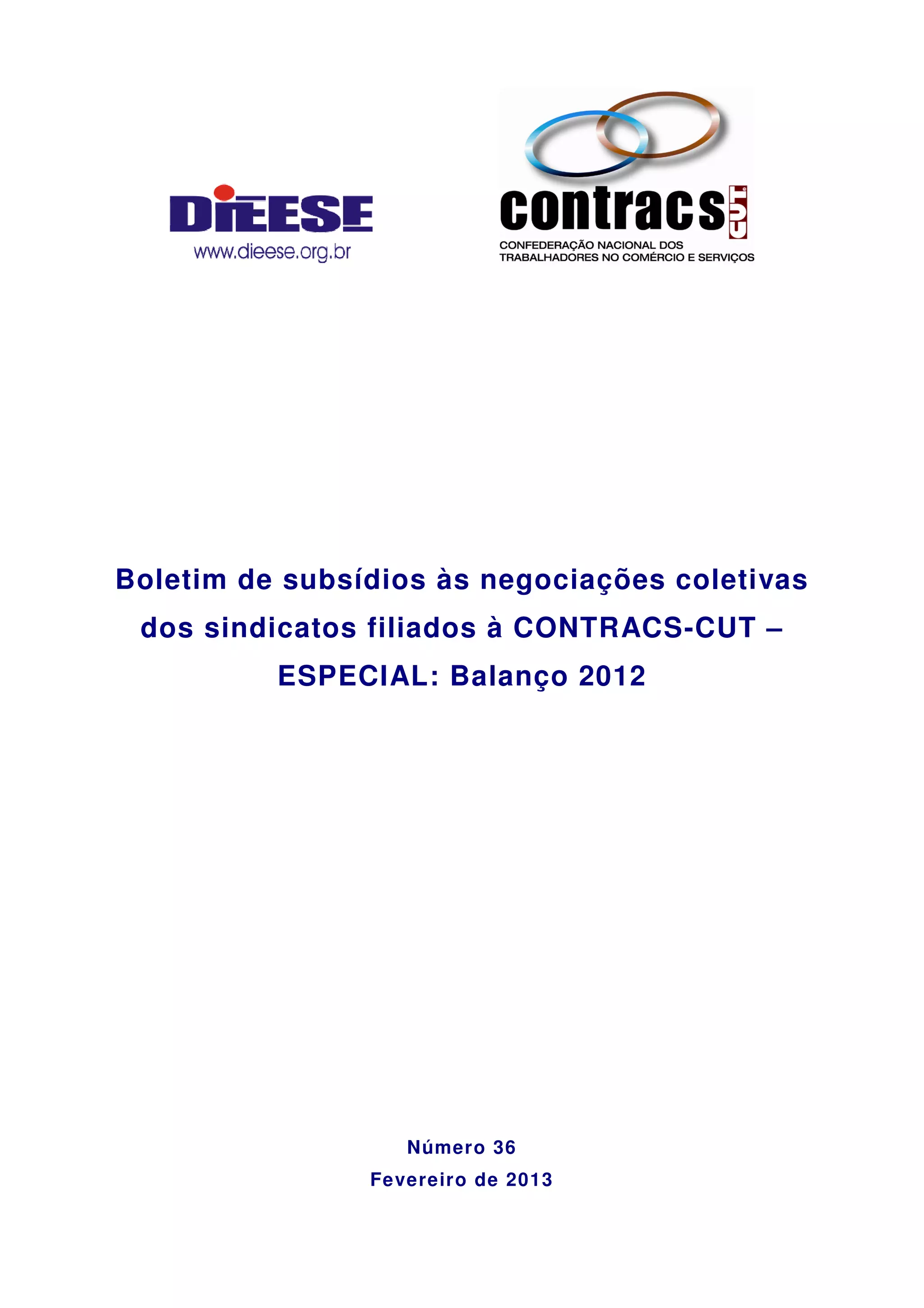 Este boletim mensal da CONTRACS-CUT apresenta: 1) Um balanço da conjuntura econômica global e doméstica em 2012, com crescimento abaixo do esperado no Brasil. 2) Dados sobre o mercado de trabalho no Brasil em 2012, com aumento do desemprego. 3) Informações sobre a geração de empregos formais no comércio e serviços em 2012.