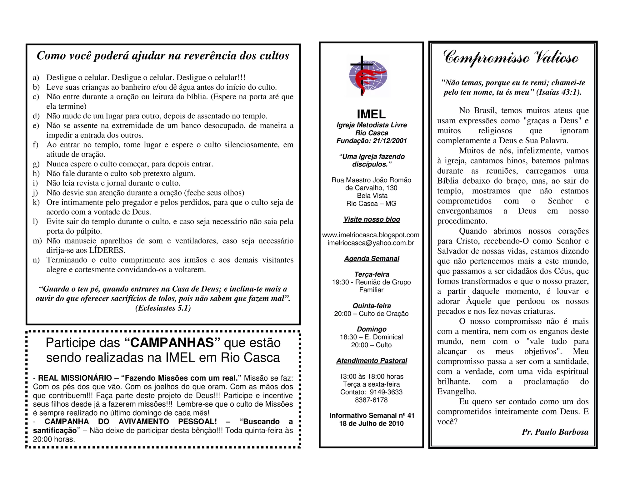 O documento fornece instruções sobre como participar respeitosamente dos cultos religiosos (a-l) e também informa sobre os compromissos da Igreja Metodista Livre de Rio Casca, incluindo sua agenda semanal de atividades (cultos, estudos bíblicos, etc.), aniversariantes e avisos.