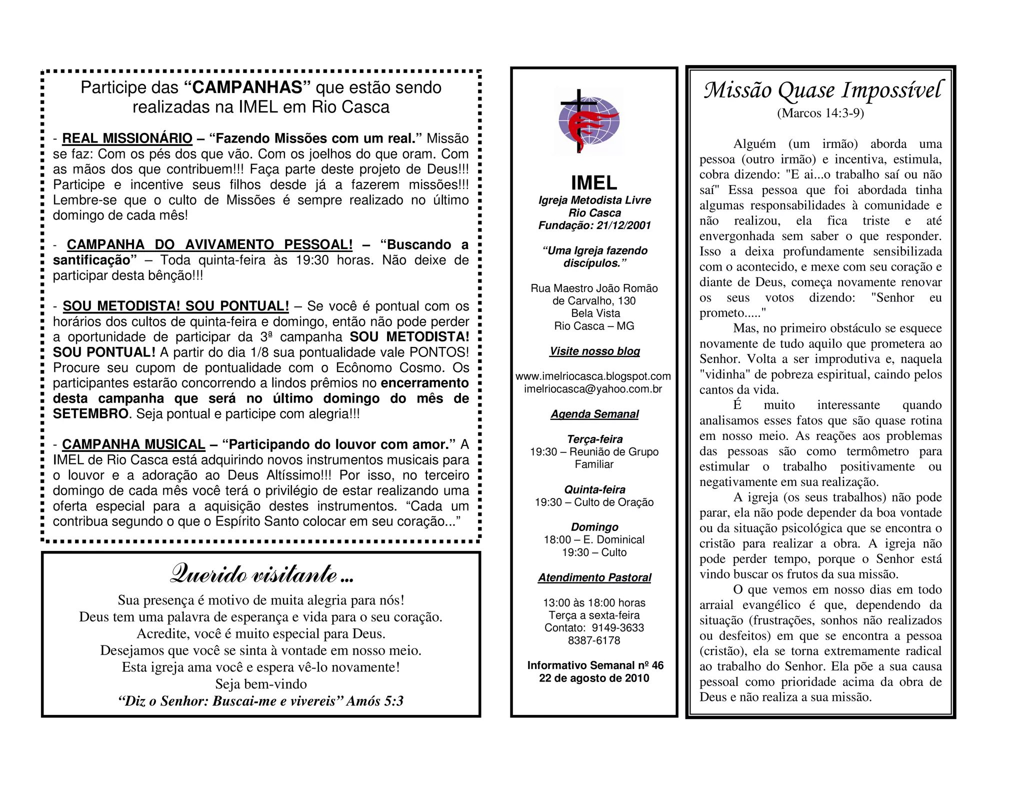 1) A IMEL de Rio Casca está promovendo diversas campanhas para arrecadação de fundos, incluindo campanhas missionárias, de avivamento pessoal e musical.