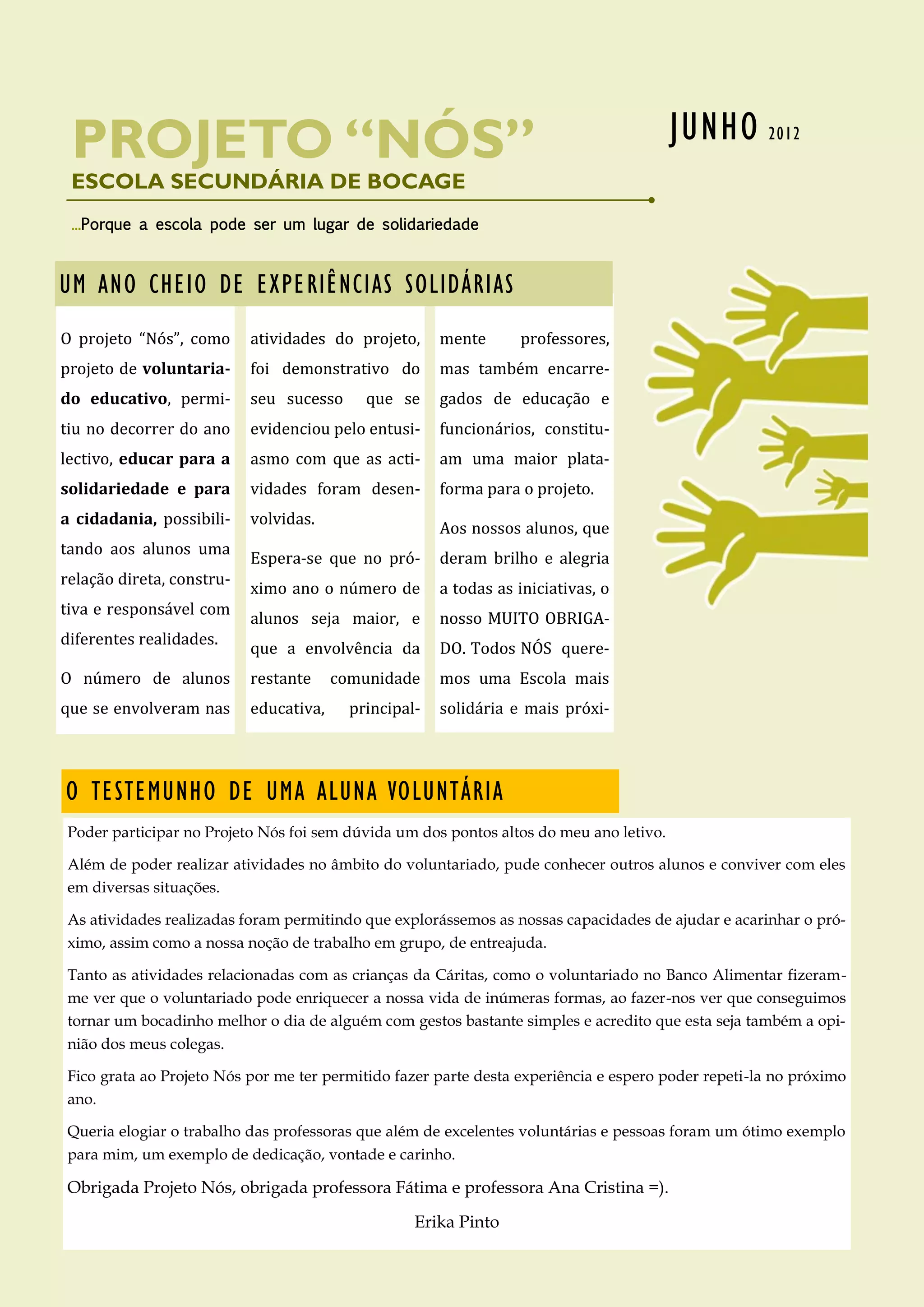 Este documento descreve as atividades do projeto "Nós" na Escola Secundária de Bocage durante o ano letivo de 2012, que teve como objetivo promover a solidariedade e cidadania. O projeto envolveu muitos alunos em atividades de voluntariado e arrecadou fundos para instituições locais. As atividades incluíram visitas a abrigos, campanhas de arrecadação de alimentos e uma exposição sobre projetos solidários.